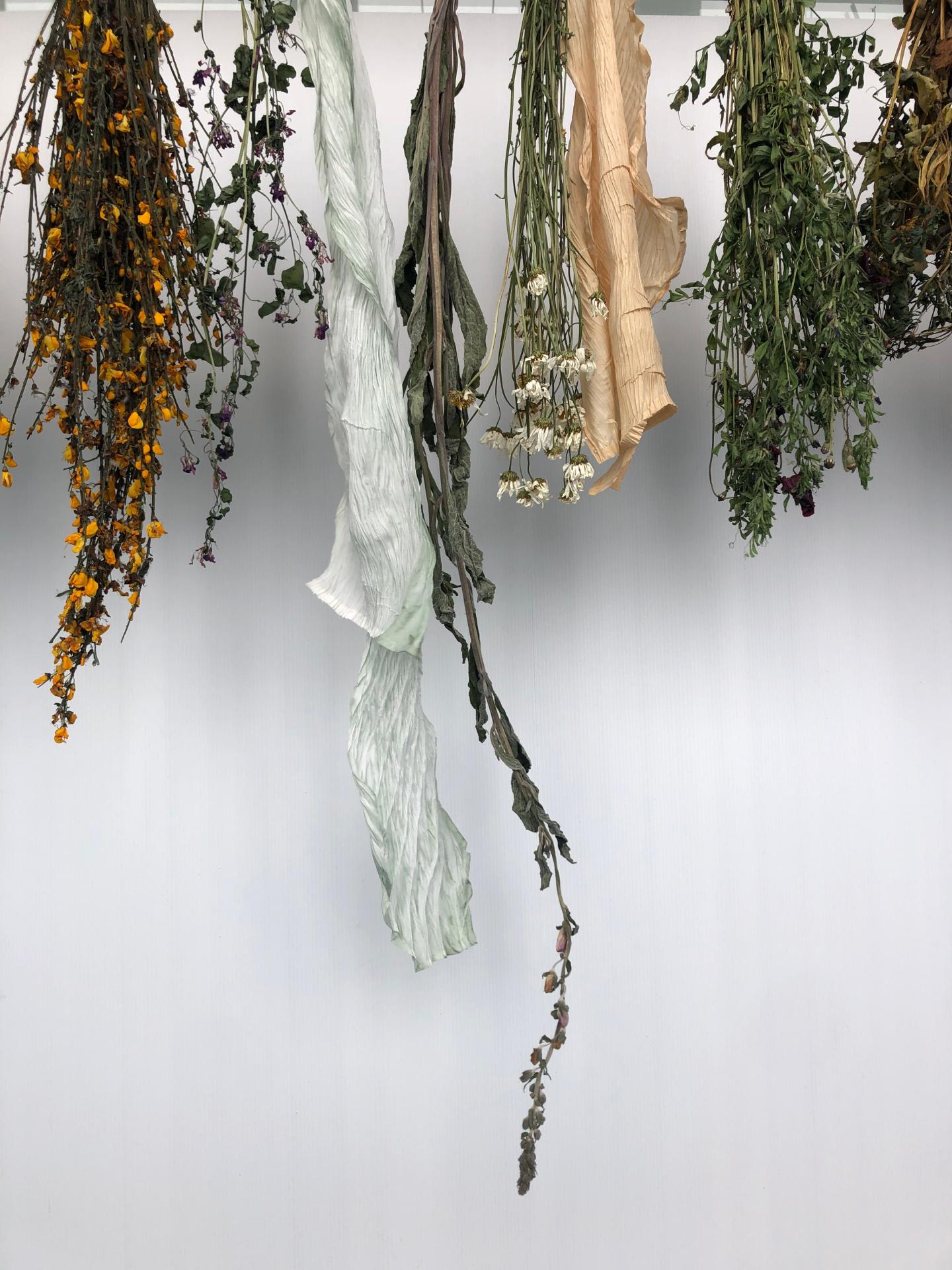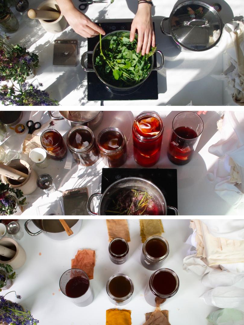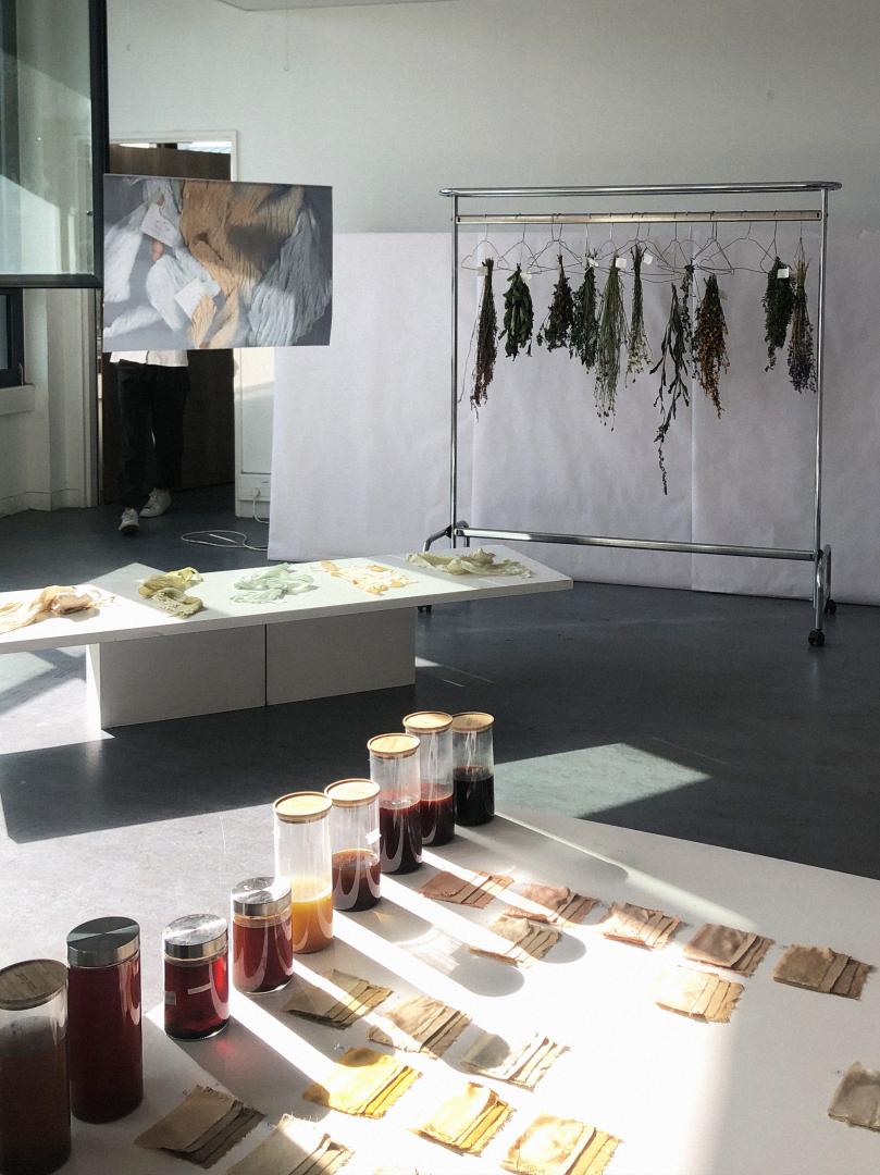 More concretely, my approach consists of picking plants in a given area (in this case, the Creuse) at a specific time of the year (summer, spring, autumn, winter). Following these harvests, the idea is to make dyes in rainwater baths using a solar dyeing process. Solar radiation and the pH of the rainwater tend to vary the characteristics of the dye bath and thus the final colour on the textile material. In this sense, the mixture of "meteorological ingredients" and "seasonal ingredients" allows us to literally obtain what can be called the "colors of the weather", because it is indeed the solar energy and the rainwater that set the tone and condition the final colour.