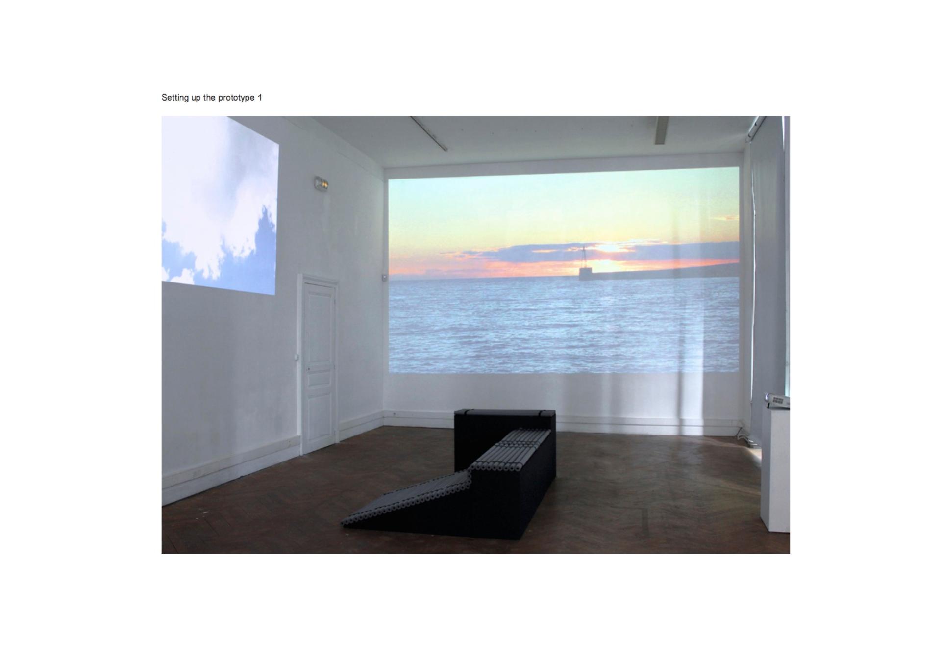 In this installation the idea is to retranscribe the sensations that one can feel outside, in a waiting room. For example: a sunset, a landscape or clouds. In the center different shapes create seats of "visions". Some planes are high, inclined or straight. These elements bring a comfort, a trajectory and they are woven like rafts ready to embark and accompany us in the vision of these images. The audience immerses itself, concentrates, breathes and comes out of it soothed.
