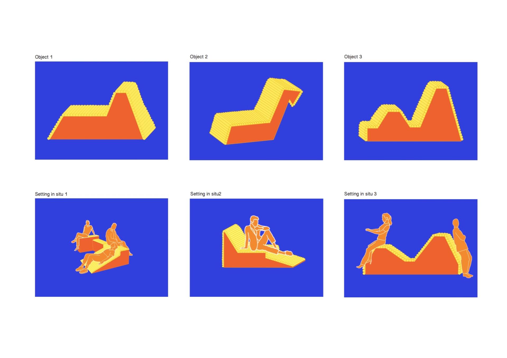 This space, installed in the waiting room, is composed of a set of seats with different inclinations and images of sunset, sunrise and sky, it is designed to help relax those waiting (patients, staff, individuals and/or family.)People can gather in the center of the room where the seat is located and watch moving images that are meant to distract and soothe them. The waiting room is a place of tension, often narrow, and dull, people are bored. The wait is long and the only diversion is on the small table in the center where old magazines form dilapidated and colorful buildings. The goal is to transform this room into a place of tranquility dedicated to escape.