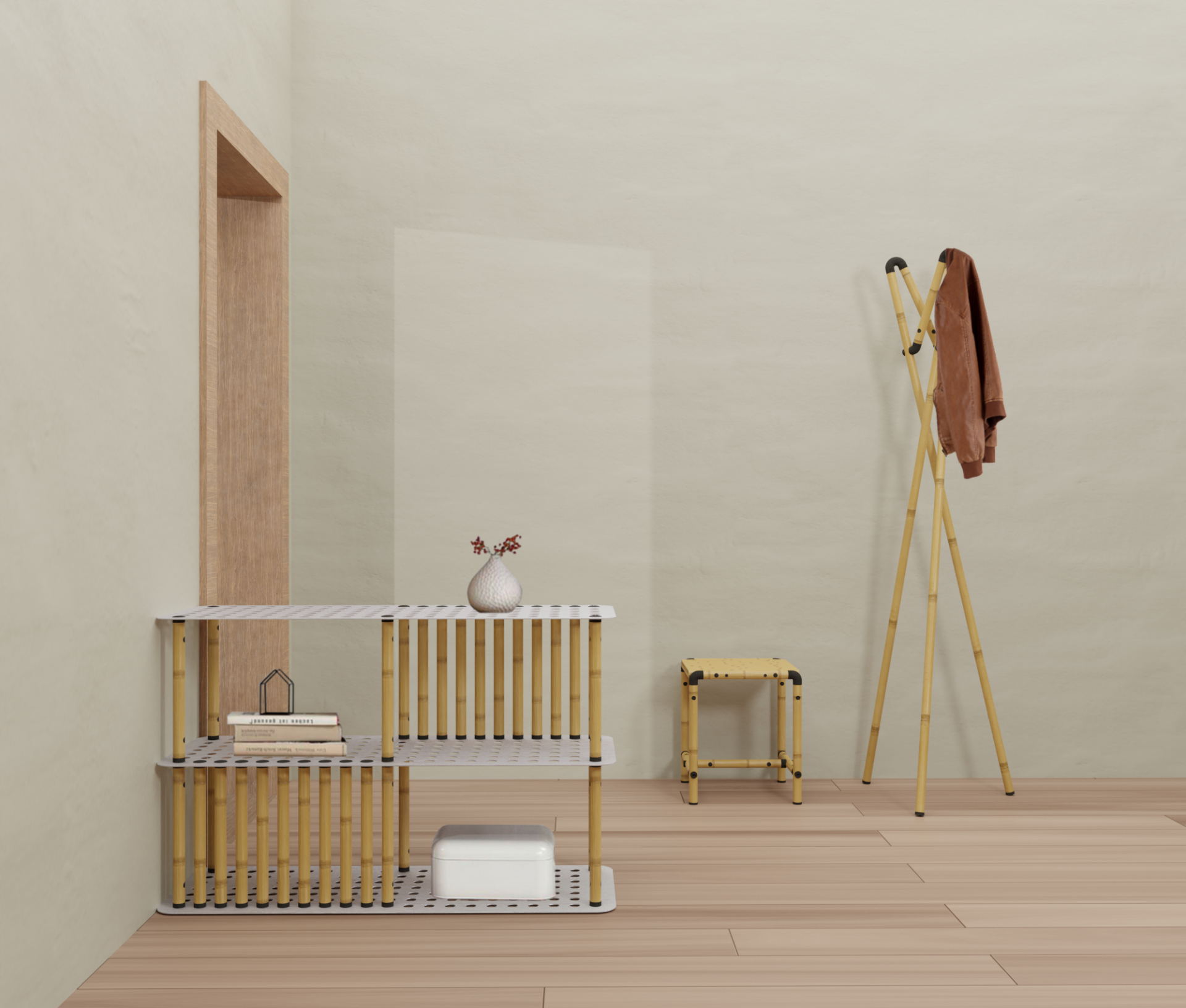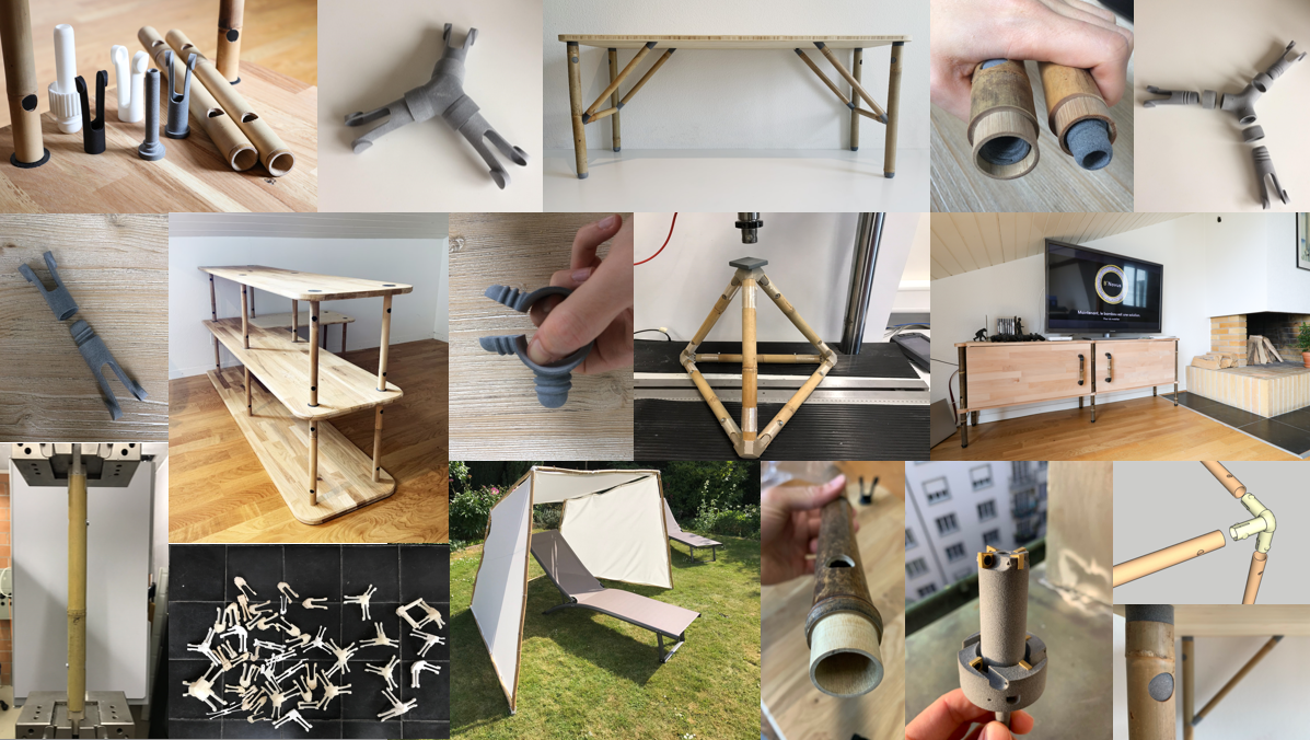 The structural use of bamboo in Europe is currently hampered by the lack of suitable connection systems, which do not require any specific knowledge of the material, which is standardized and with attractive aesthetics for the European public. That is why we have developed a connection system that standardizes and modernizes the use of bamboo canes for furniture. Our system is very easy to assemble and disassemble, which makes it possible to create modular furniture, which are therefore adaptable, transportable, and easily repairable.