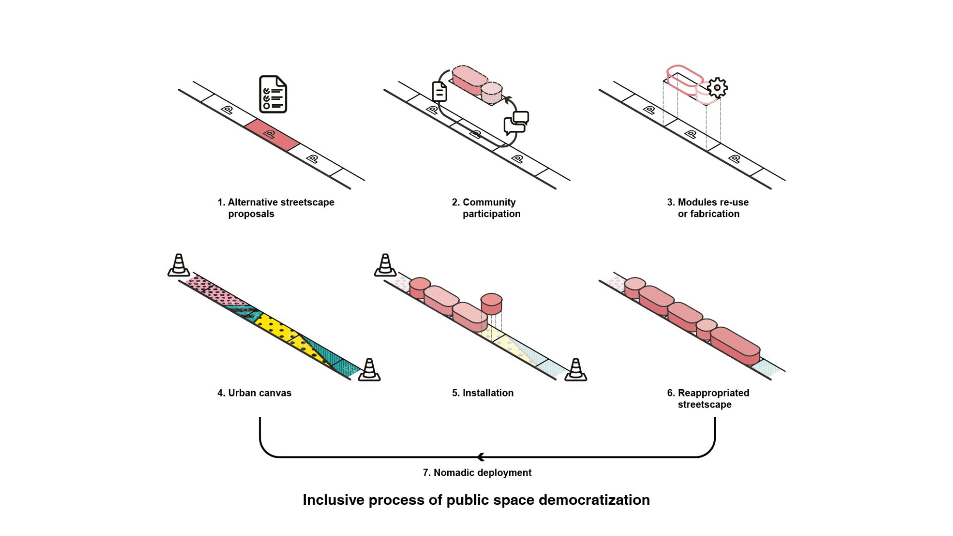 In this context, a new type of urban intervention emerges; those aimed at reallocating parking spots to public space designed for/by people. Often, these interventions are received skeptically by institutions as they are assumed to be time intensive to implement or not scalable. The process we propose is to combine the scale of centralized planning, with parametric geo-localized analysis, with the scope of citizen participation, by inviting citizens to be part of the shaping of public space.