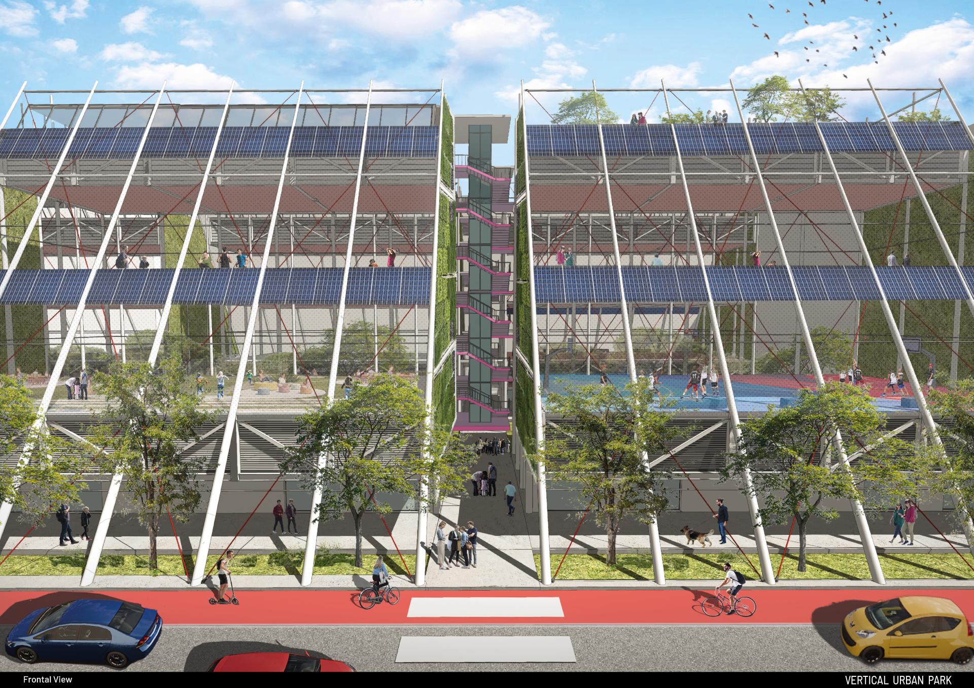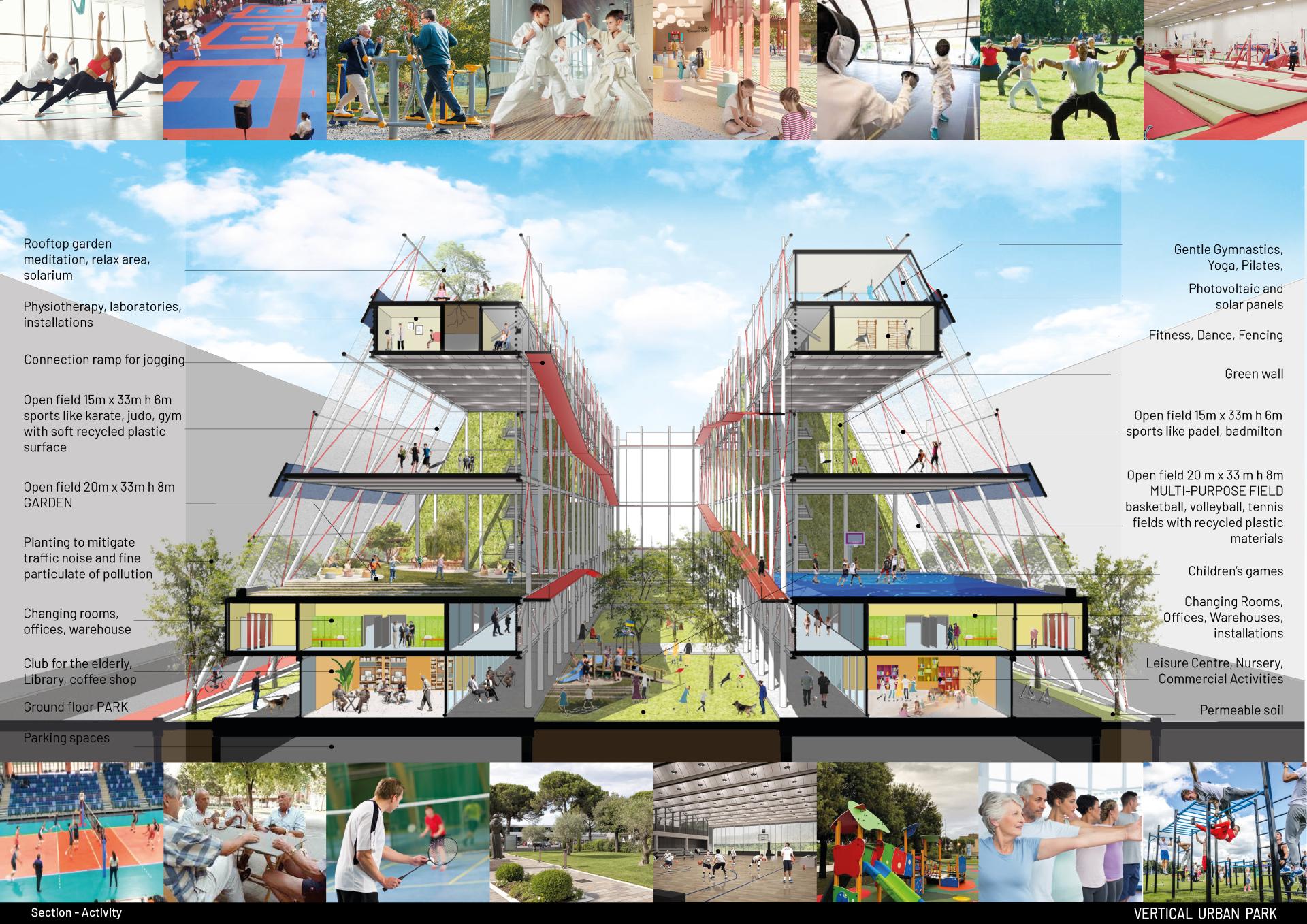 The idea of placing sports fields and public spaces vertically responds to the need for lack of soil within a densely populated urban fabric.