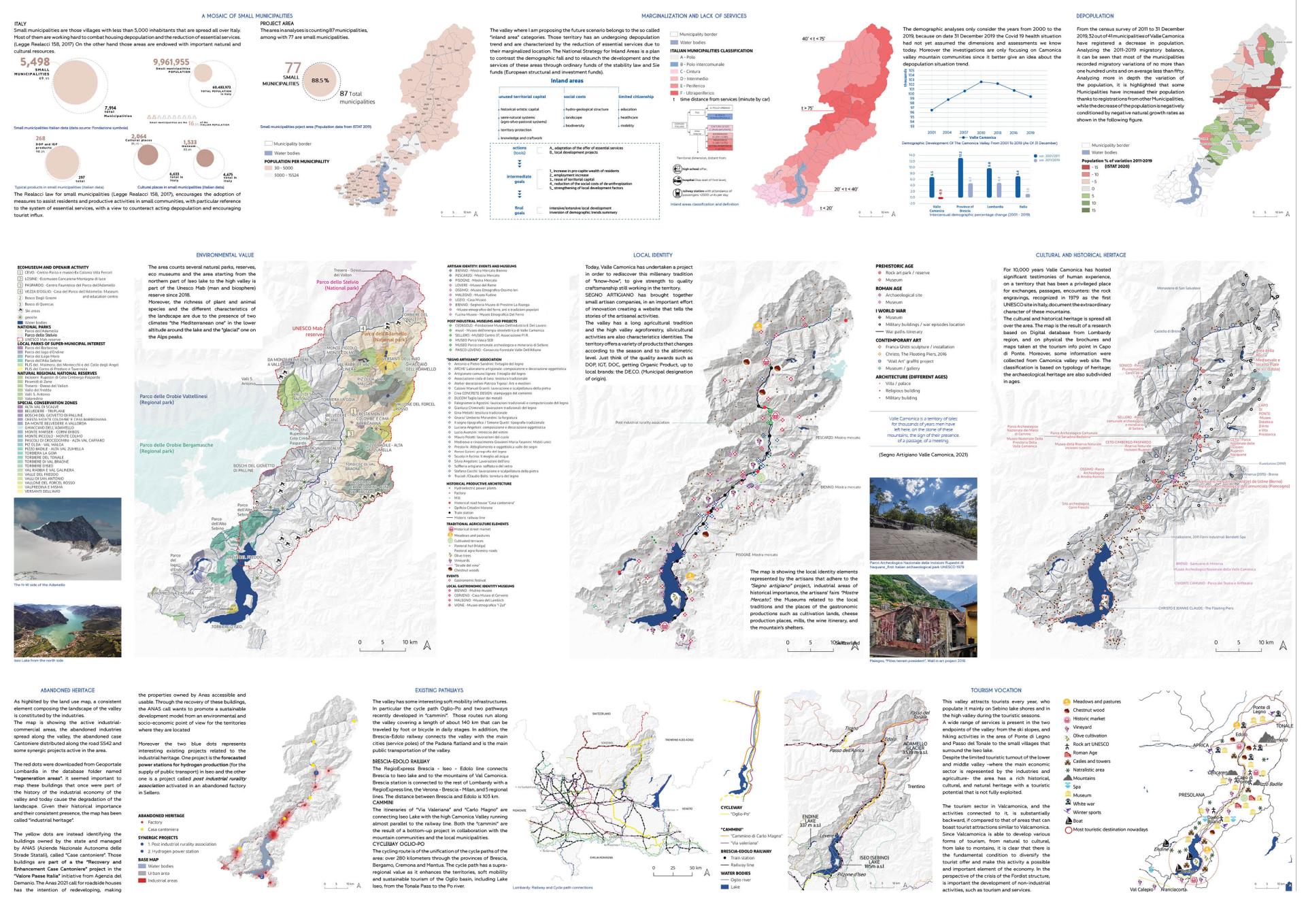 Structural handicaps, lack of services and depopulation problems are the keywords that are used to define the so-called internal areas that represent almost 70% of the Italian territories. On the other hand, these territories have great potential thanks to their traditions, culture, beauty, naturalness, and ancient knowledge. This is the case of the Camonica Valley and Sebino Lake; which can be defined as a widespread museum in a valley that extends for more than 150 km from the lake at the foot of the Prealps to the alps peaks and Adamello glacier. Despite the enormous potential, the valley’s tourism system is backward in comparison with other similar realities and the demographic trend confirms the depopulation. In addition, the industrial sector that has developed largely along the valley floor has its ancient roots that are historically important for the economy of the valley, but today it is perceptible as an element of decay and abandonment. The concept is based on the initial hypothesis of sustainable development of marginalized territory. The application of the concept aims to respond to different needs of the territory, taking into account opportunities and territorial resources to transform the elements of degradation into meeting points and services for different stakeholders. The main objectives of the concept are to give new life to the abandoned heritage, to trigger the development of slow tourism along soft mobility itineraries, to create services for travellers and for the local population and to give economic input to those areas affected by depopulation. The future scenario outlined by the concept project is therefore based on the use of existing territorial resources to give life to a systematic program of interventions aimed at the resilience of these peripheral places with a rich attractive potential.