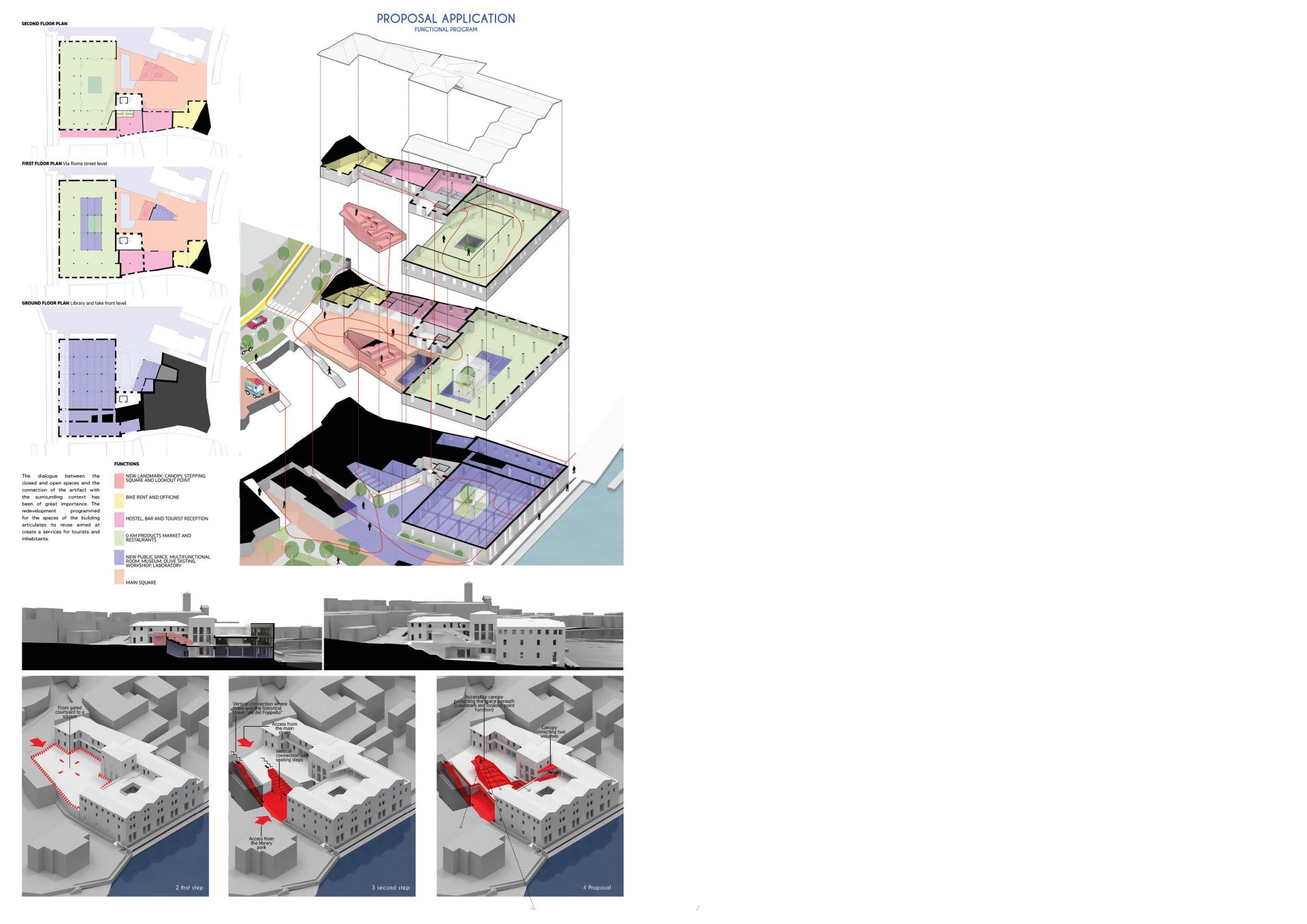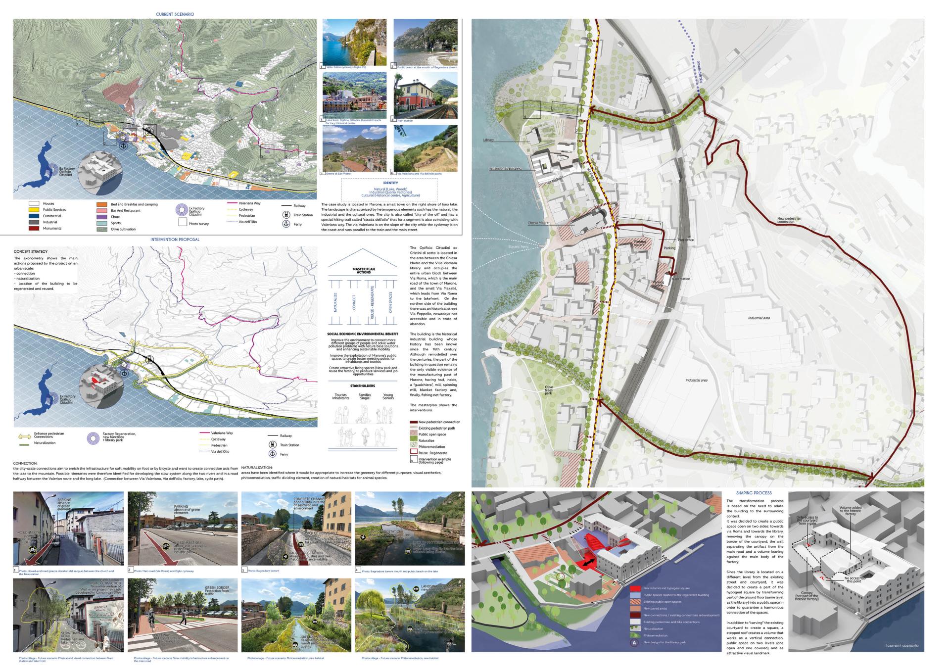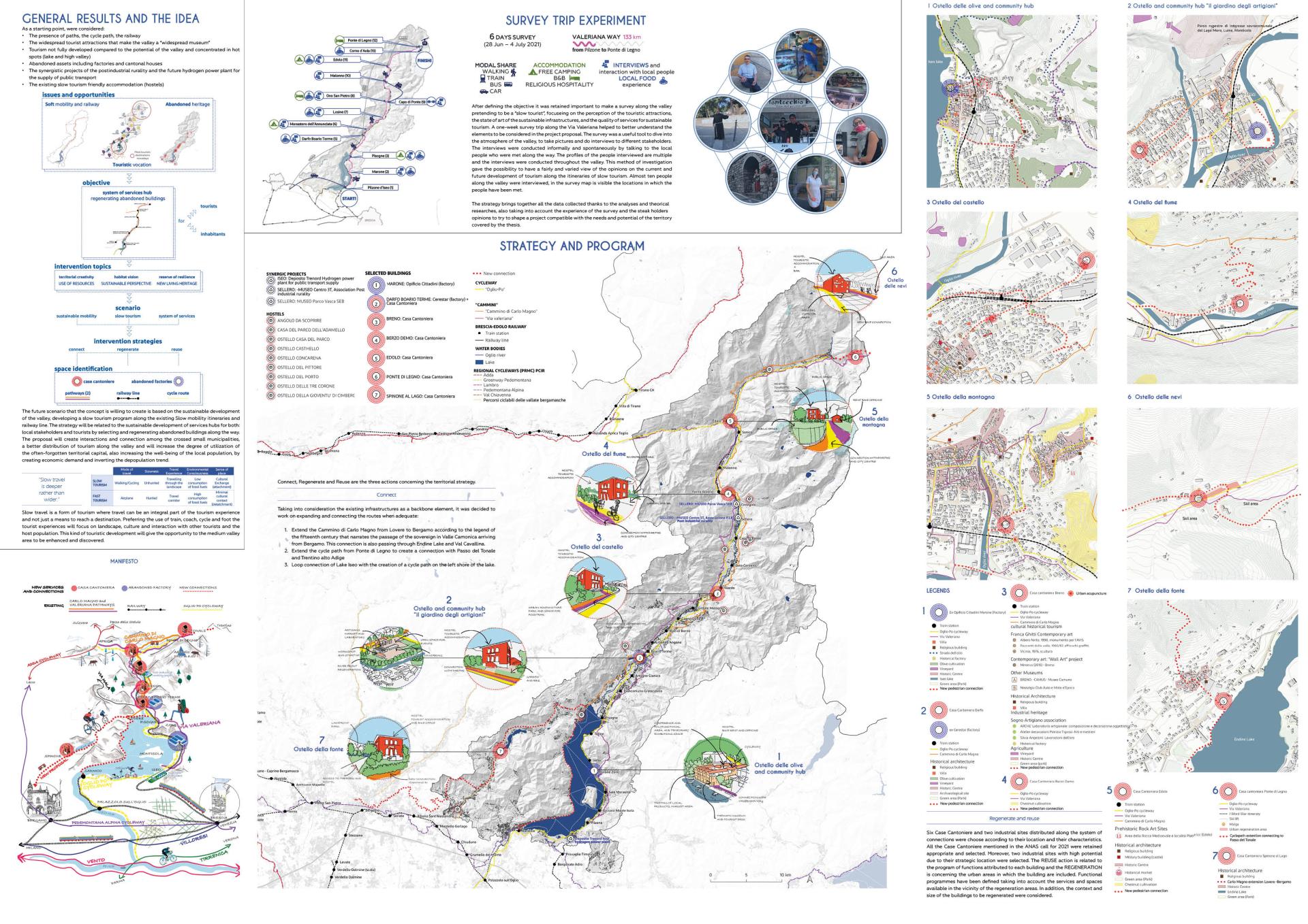 The concept is based on Slowtourism as the key of future economic development of the valley, however, it will also bring to the area other benefits. The proposal will create interactions among municipalities, a better distribution of tourism along the valley, and will increase the degree of utilization of the territorial capital, also increasing the well-being of the local population. Slow tourism involves the tourist slowing down, and often doing less, in order to gain a deeper understanding of the surroundings, community, and authentic culture. The slow tourist not only contributes with economic value but also by developing a legitimate interest, respect, and consideration for local culture and traditions. Moreover, slow tourism is beneficial for marginalized communities. It can help develop a greater entrepreneurial spirit and decision-making capacity about the future of the region among its inhabitants, the result will then foster community cohesion. The scenario thinks about tourists, local population, and future new people attracted to the area for longer or shorter period. The redevelopment of the buildings will articulate their reuse aimed at both activities that can enhance the local tradition (tasting local products, local products market area), those dedicated to the preservation of the historical and cultural memory of Lake Iseo and the Camonica Valley (thematic museum, tourist reception, and temporary exhibitions) and those related to the creation of a community hub (creating a flexible space that can be used as conference or exhibition space or simply a public urban space). The services hub will also bring some urban transformation in order to connect the context to the buildings and improve the soft mobility with the social and environmental benefits (improve the environment to connect more different groups of people and solve pollution problems with nature base solutions, the exploitation of public spaces to create meeting points for local and touris