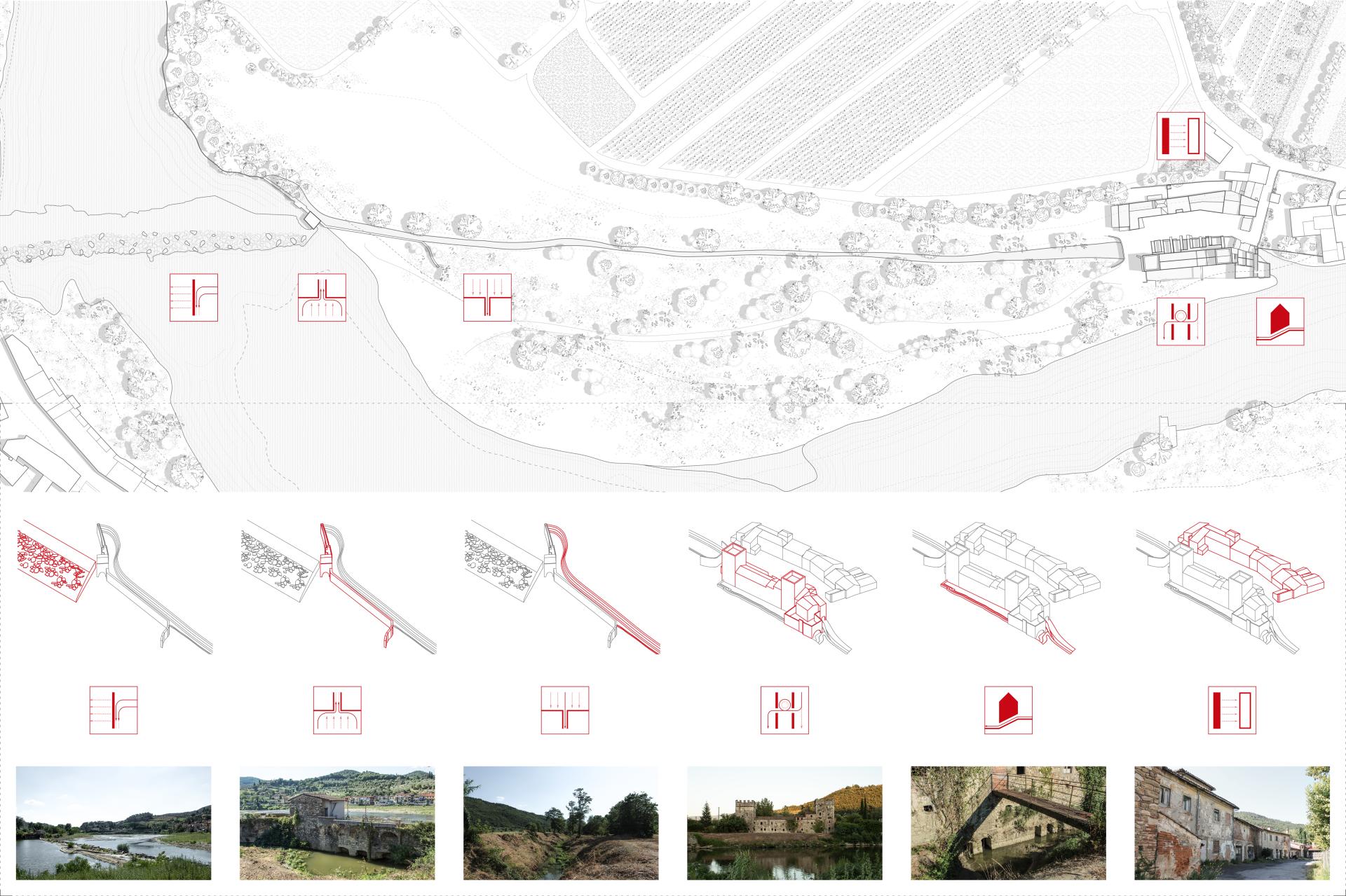 Therefore, we proceed to rewrite this existing system, using the factory as an operational tool to resolve critical issues in the territory: an occasion of comparison between architecture and the water element. The strategy consists of three different phases that are interlinked to one another. The first one consists of the arrangement of the riverbank. Achieved this result, it will be possible to have a new agricultural space that will welcome and resurrect the complexity typical of the Tuscan landscape. The second phase involves the realization of research and diffusion of a craftsmanship centre. As the fulling mills in the past were a focal point in the processing of wool cloths, today the fortress would be protected by a new body dedicated to the awareness and innovation in this sector. The third and final phase provides the graft of specific sites within the medieval complex to allow a new usage that includes hospitality museum, and laboratories open to the local community.