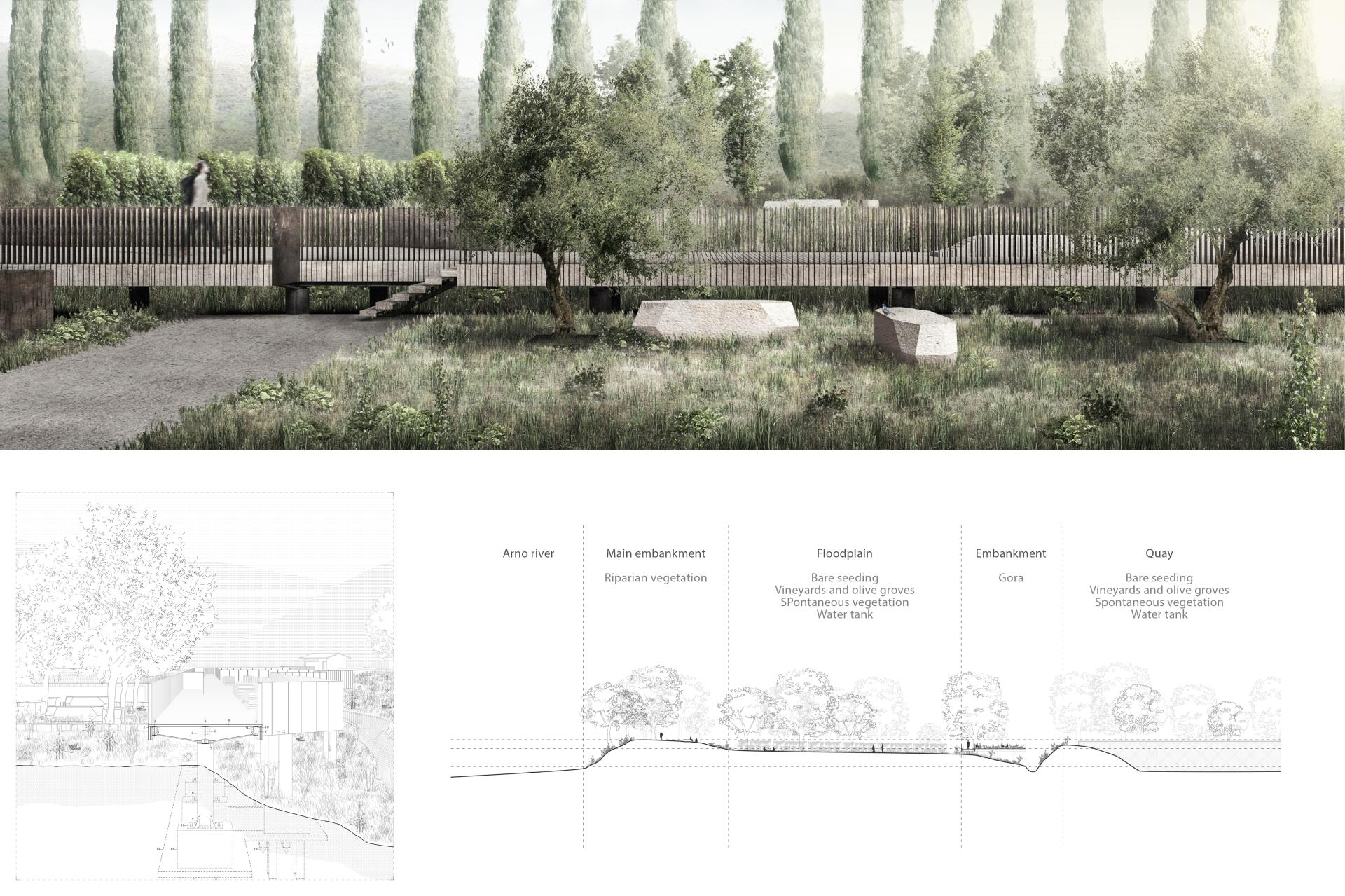 Another central feature to be taken into consideration is the agricultural complexity, which is made up of varied vegetation. In fact, in the project the planting of new tree species of various types is also fundamental: first, the location of riparian vegetation, composed mainly of holm oaks and alders, along the banks of the river, allows to mitigate the flow of water; besides, the introduction of traditional Tuscan plantation such as vineyards and olive groves, and the local one, too.