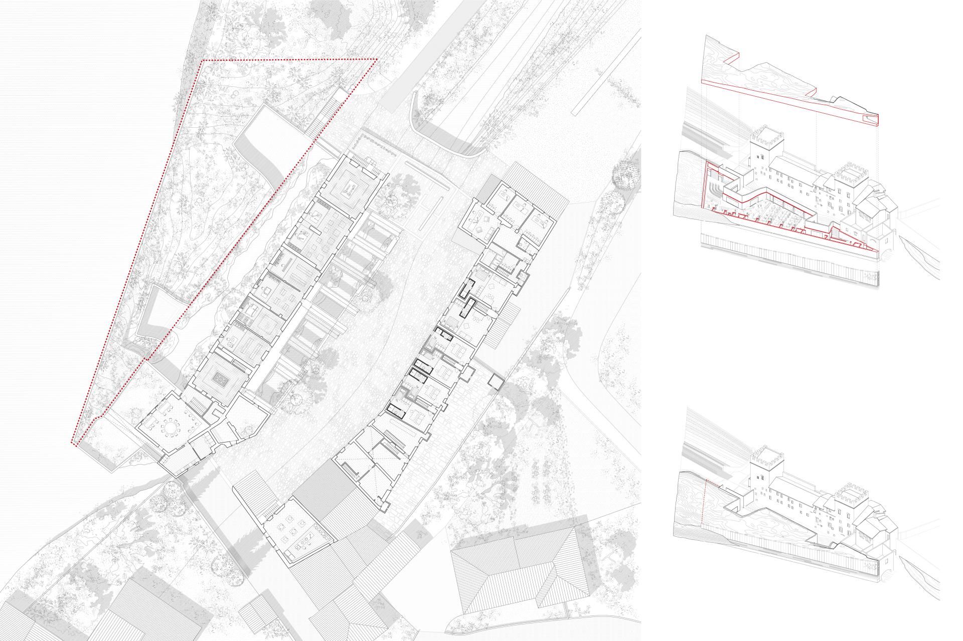 The second phase, however, is an opportunities which can be summed up within the concept of limit: limit seen as boundary and protection of the water element; limit as boundary between natural and built and limit as a dialogue between new and ancient. The achievement of these first two phases lays the foundations for a conscious and effective reuse of the historical complex. It is at this point that the valorisation of the ancient becomes possible: the moment when there are new systemic and identitary conditions of the site that would not nullify a conservation process otherwise isolated from any connection with the territory. This proposal’s implications open up numerous issues concerning which relations architecture can effectively generate in rural contexts excluded from plans of strategic representation. The thesis research poses as a possible, and not as the only viable, solution to reflect on the ways in which architecture can summarise the whole system of skills and relations specific to the site. Therefore, this thesis aims to obtain, as a final result, a contemporary element with intrinsic characteristics, able to respond effectively to both the peculiar needs of the landscape and the built environment.