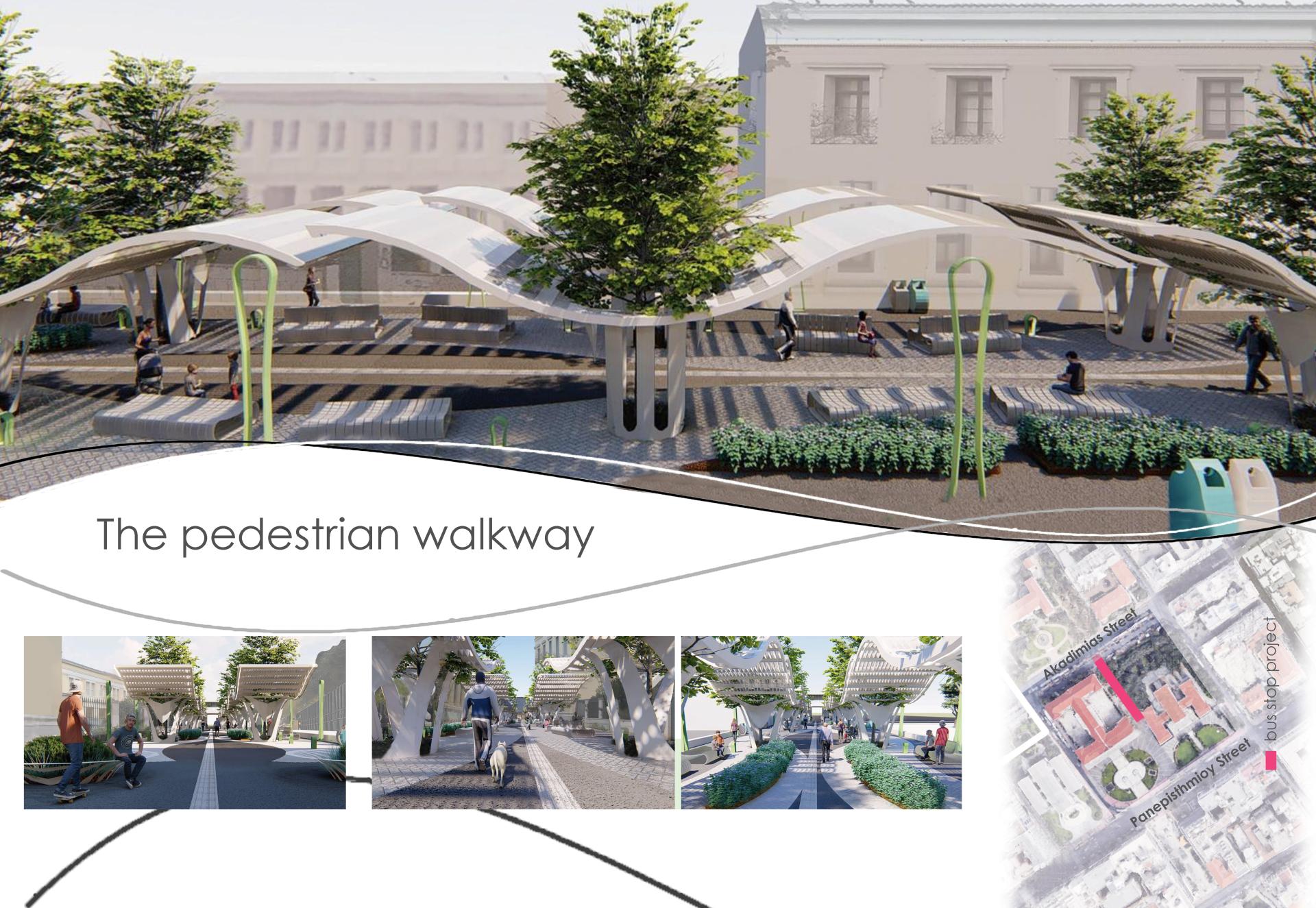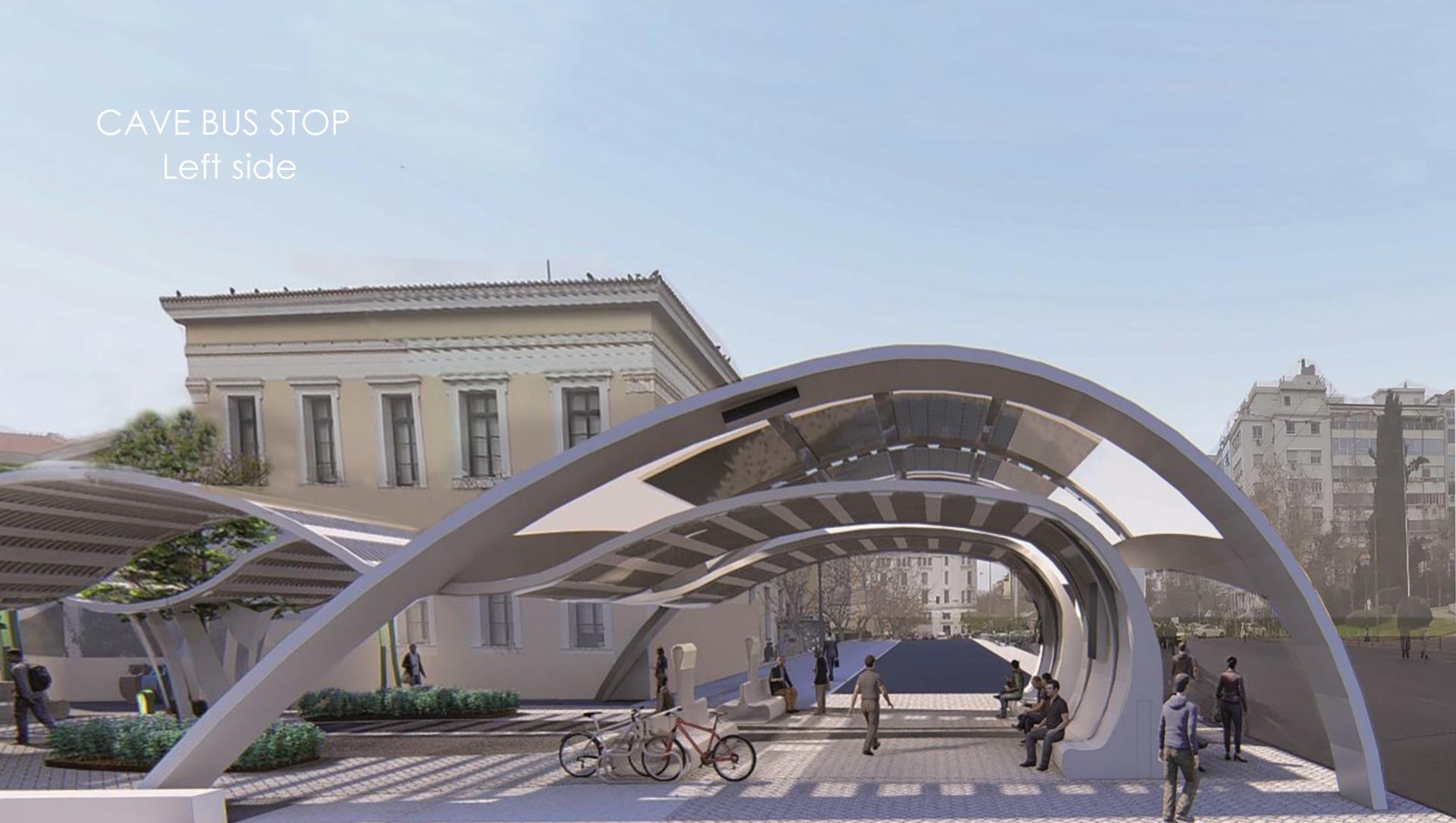 The idea is the reconstruction of a bus stop and the renovation of a pedestrian walkway adjacent to it, to satisfy all users' needs at Academia Street in the center of Athens. The main goal is to provide people that commute and travel an environment-friendly green haven that is built upon a sustainable and aesthetic constitution. In parallel the design's cornerstone is the ability of the station to be totally self-sufficient and low maintenance while supporting a continuous flow of people.