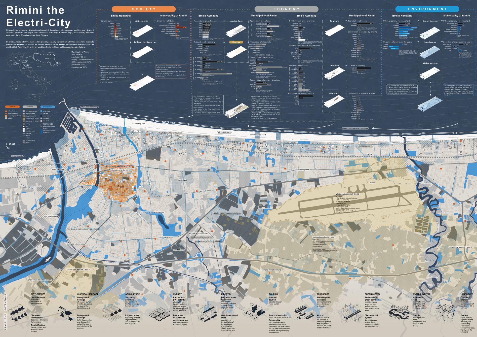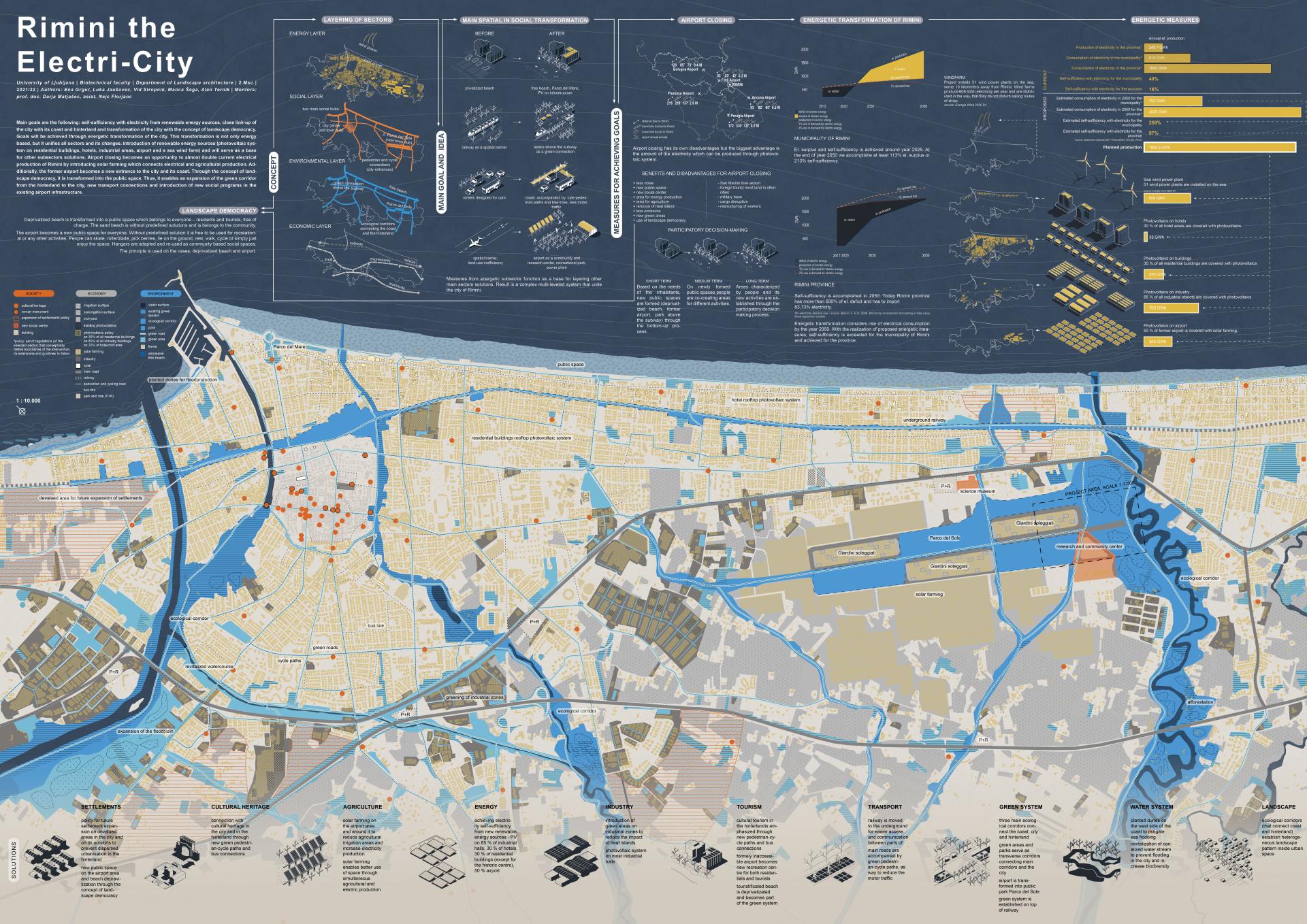 By dividing Rimini into three main sectors (society, economy, environment with their subsectors) we can analyse main data and defined main key findings, which allow our plan to embrace goals such as environmental sustainability, increase of landscape quality, quality of experience and social inclusion of residentials and tourists. Main goals are the following: self-sufficiency with electricity from renewable energy sources, close link-up of the city with its coast and hinterland and transformation of the city with the concept of landscape democracy. Goals were achieved through energetic transformation of the city. The transformation is not only energy based, the energy system also serves as a combining link for a sustainable way of obtaining electricity, social inclusion of the inhabitants and improvement of the quality of space and life in the city. Introduction of renewable energy sources (photovoltaic system on residential buildings, hotels, industrial areas, airport and a sea wind farm) will serve as a base for other subsectors solutions. Airport closing becomes an opportunity to almost double current electrical production of Rimini by introducing solar farming which connects electrical and agricultural production. Additionally, the former airport becomes a new entrance to the city and its coast. Through the concept of landscape democracy, it is transformed into the public space. Thus, it enables an expansion of the green corridor from the hinterland to the city, new transport connections and introduction of new social programs in the existing airport infrastructure.
