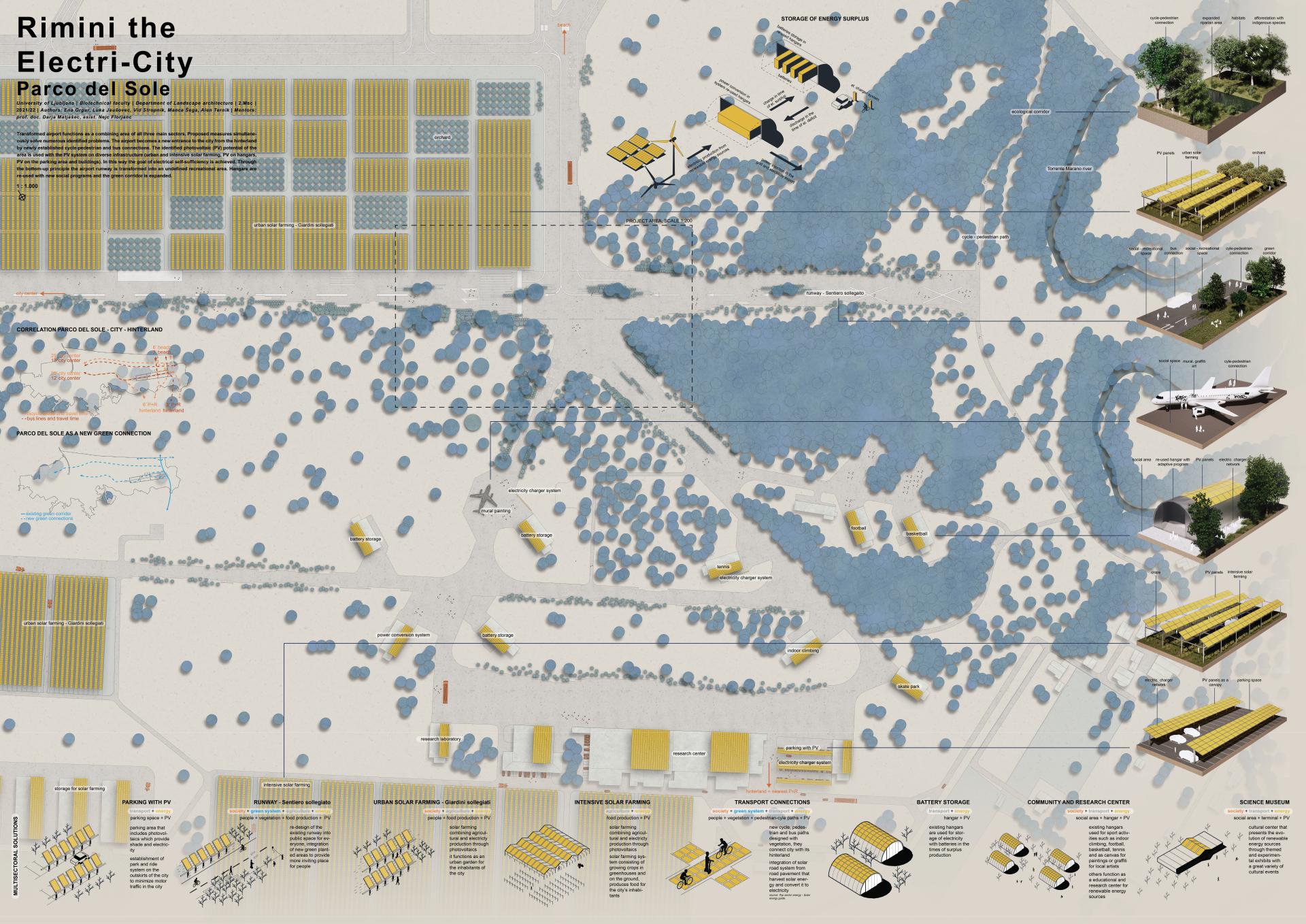 Rimini is one of the most attractive coastal cities in Italy, visited by millions of tourists every year. This fact is also reflected in its historic development, city characteristics as well as in different conflicts between uses. Recognized conflicts are addressed with multi-sectoral solutions of three main sectors (society, economy and environment), which will transform Rimini into a holistic and connected system. This system is being realized in newly established green corridors, formation of public spaces, transport and social connections coast – city – hinterland. Leading factor in transforming Rimini into the unified system are energy-based measures. They realize the goal of self-sufficiency with renewable energy sources. Photovoltaic system is being implemented on residential buildings, hotels, industrial areas and the airport, while wind farms are being built on the sea. These steps serve as a base for other subsectors solutions and thus energetic transformation of the city is not only energetic but also comprehensive. The airport closing functions as a combining area of all three main sectors and as an opportunity to realize a set of goals by introducing solar farming which connects electrical and agricultural production, expansion of green corridors as well as shaping of the public space through the process of landscape democracy. It also becomes a new entrance to the city and its coast from the hinterland by establishing additional cycle-pedestrian and bus connections. Through the bottom-up principle the airport runway is being transformed into a public area that is open to all inhabitants for interpretation.