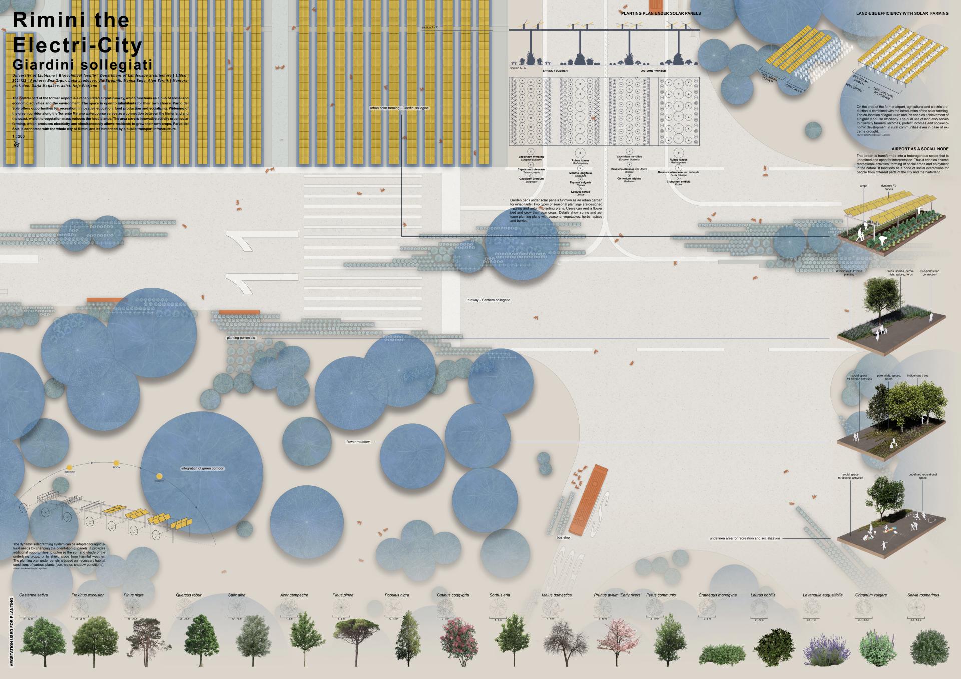 Airport closing becomes an opportunity to almost double current electrical production of Rimini by introducing solar farming which connects electrical and agricultural production. Additionally, the former airport becomes a new entrance to the city and its coast. Through the concept of landscape democracy, it is transformed into the public space. Thus, it enables an expansion of the green corridor from the hinterland to the city, new transport connections and introduction of new social programs in the existing airport infrastructure. The airport is transformed into a heterogeneous space that is open for interpretation through the bottom-up principle.
