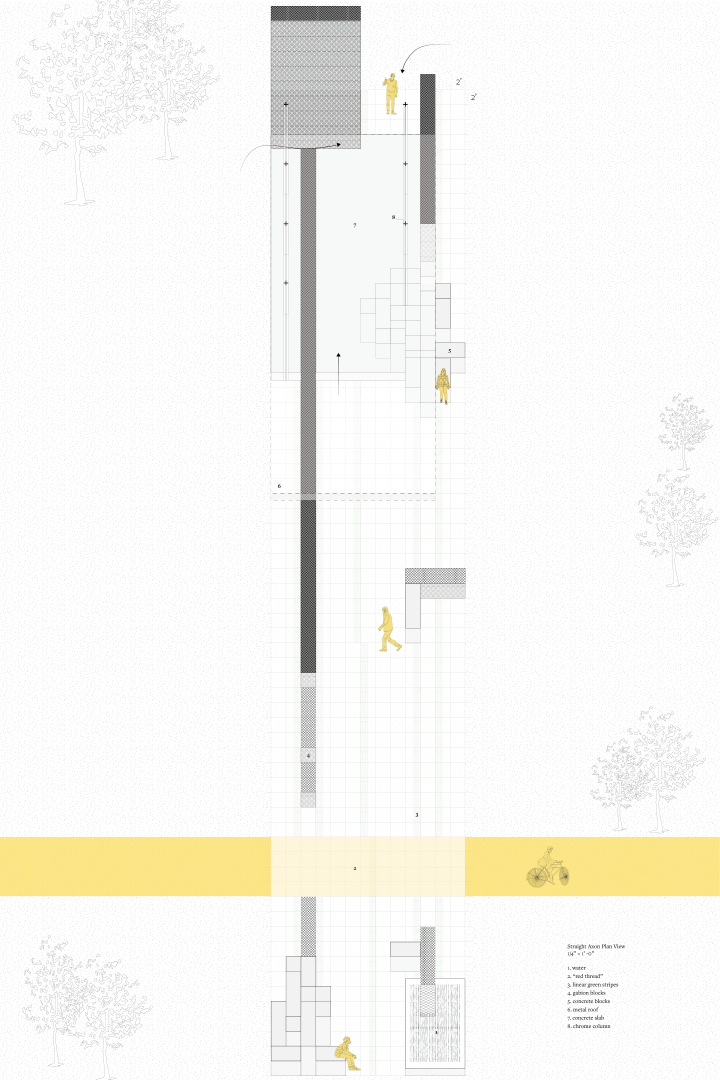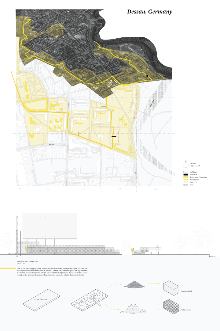 After the war, Dessau demolished a series of industrial facilities and housing structures due to a shrinkage in population and a decline in urban fabric. This caused the reconfiguration of the city into five districts surrounded by a greenbelt and a “Red Thread” – a pedestrian and bike path passing through the greenbelt. This kiosk integrates a series of binaries: gabion / concrete block, roof / columns, locals / visitors, play / production, to develop a space for interaction, storytelling and local craft. Familiar materials of previous communities are implemented and showcased as pieces within the gabion walls, to reinterpret it as a vibrant new community space.