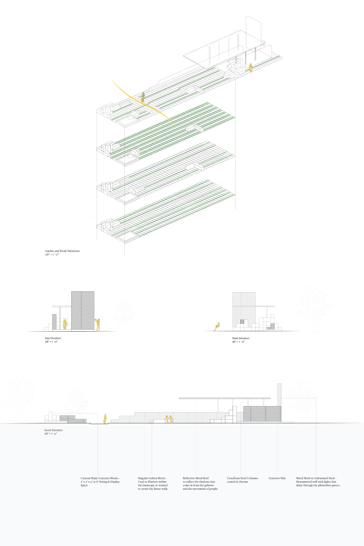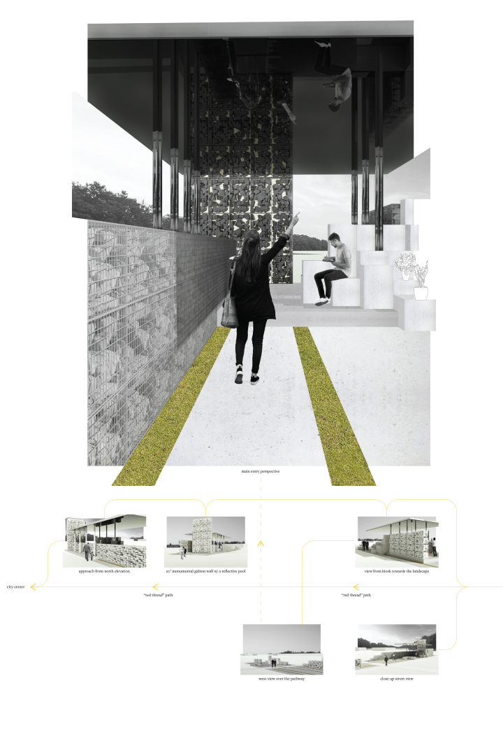 The concept bridges past Bauhaus ideals of the prairie houses to the East German community by its linear design, and monumental gabion wall. The linear site is embedded within a large green field surrounded by trees, and it crosses over the “Red Thread” path to encourage curiosity among locals and visitors. The kiosk reuses plattenbau pieces from nearby structures and turns them into, 1. Gabion walls, and 2. Enlarged concrete blocks, to develop a sense of place and create a display of history through an otherwise under-valued space. These, alongside a series of columns, a concrete slab, and a reflective metal roof, are designed based on a 2’ x 2’ grid and avoid enclosing the space to create a sense of airiness, gentleness, and framed views throughout the kiosk. The project takes pride in using the gabion as the main visual element due to its sustainability attributes such as the reduction of CO2 emissions, their modularity and potential for expanding within the site, permeability and temperature mitigation. In addition to being used as walls, they reappear at the same scale of the concrete blocks to be used as planters, while the blocks create sitting and display space around the site. These are also strategically stacked in a playful form to welcome people to use them while simultaneously creating a boundary to the kiosk.