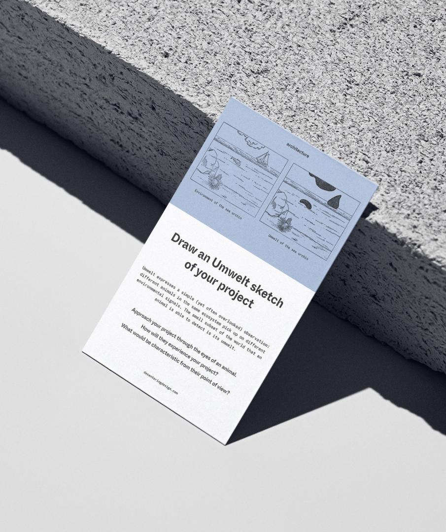 We propose a tool, taking on the design language of a card game. The cards generate random scenarios, bringing together human and nonhuman needs and narratives. The designer is confronted with a new perspective to reflect on in relation to their product. It is a small step to integrate in their thought process, with vast consequences and benefits for the more-than-human world.