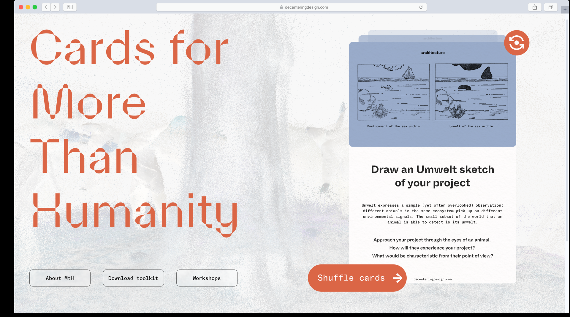 This project takes its cue from the growing realization that humans are not the only ones with agency on this planet. Animals do too. Cards for More-Than-Humanity is an online tool bringing awareness to the more-than-human world in design processes. It generates random scenarios, bringing together human and nonhuman needs and narratives. The designer is confronted with a new perspective to reflect on in relation to their product, bringing all users a step closer to a more inclusive world.