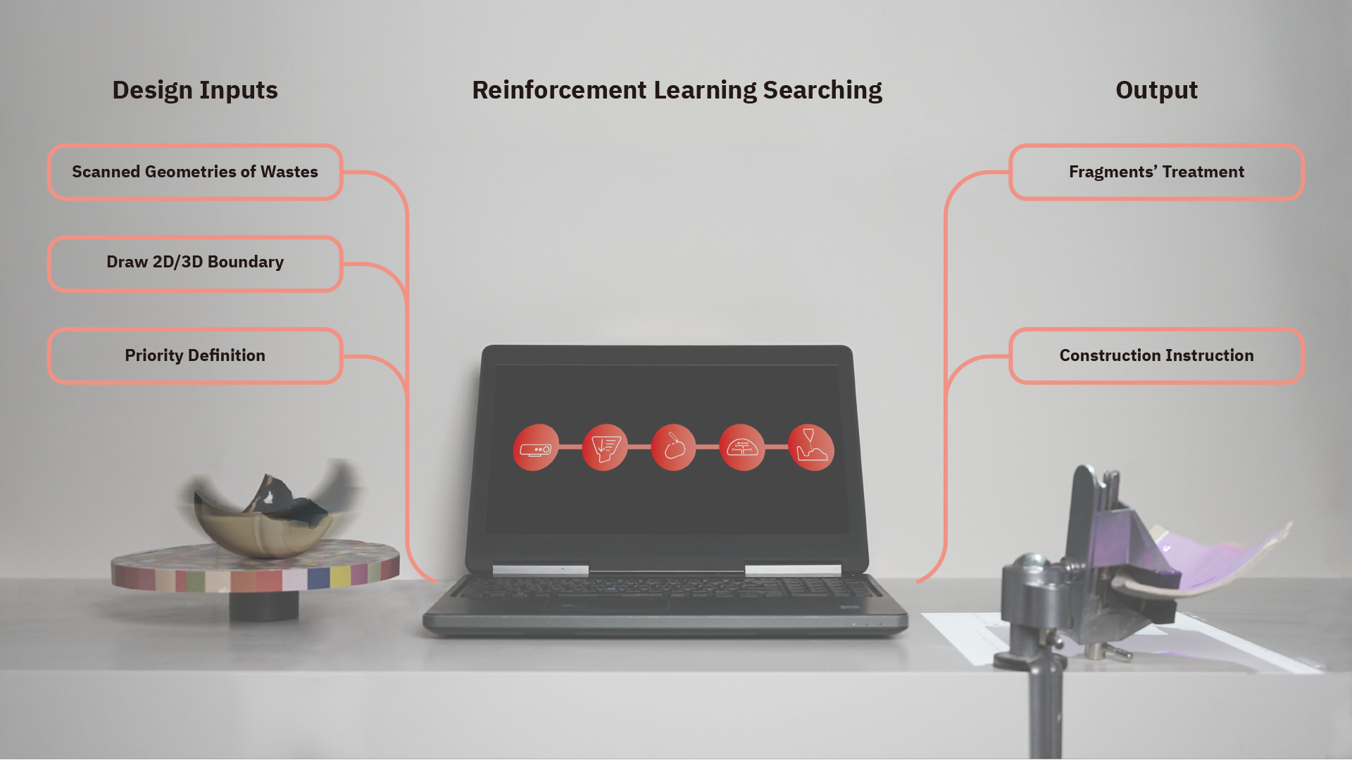 Instead of an energy-intensive process in recycling a significant amount of construction wastes such as concrete rubble, metal and wood, the program enables the direct use and design of waste materials consisting of irregular geometries. Designers no longer need to cut their design from a standard panel and throw away the rest, but they can design the form that will be assembled by various non-standard materials thanks to machine learning