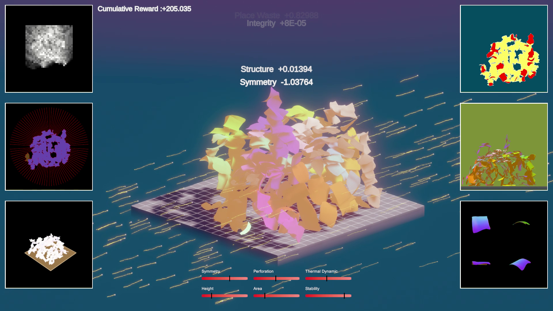 Reform Standard is a machine-learning-driven searching process that designs new structures generated from existing wasted materials. Using reinforcement learning, machine vision and automated searching process, the idea aims to promote a material-informed design circle and converts wastes into potential resources. It not only revitalises waste materials’ lifecycles, but also develops a more sustainable way of design that fundamentally changes the way we participate, evaluate and experience.