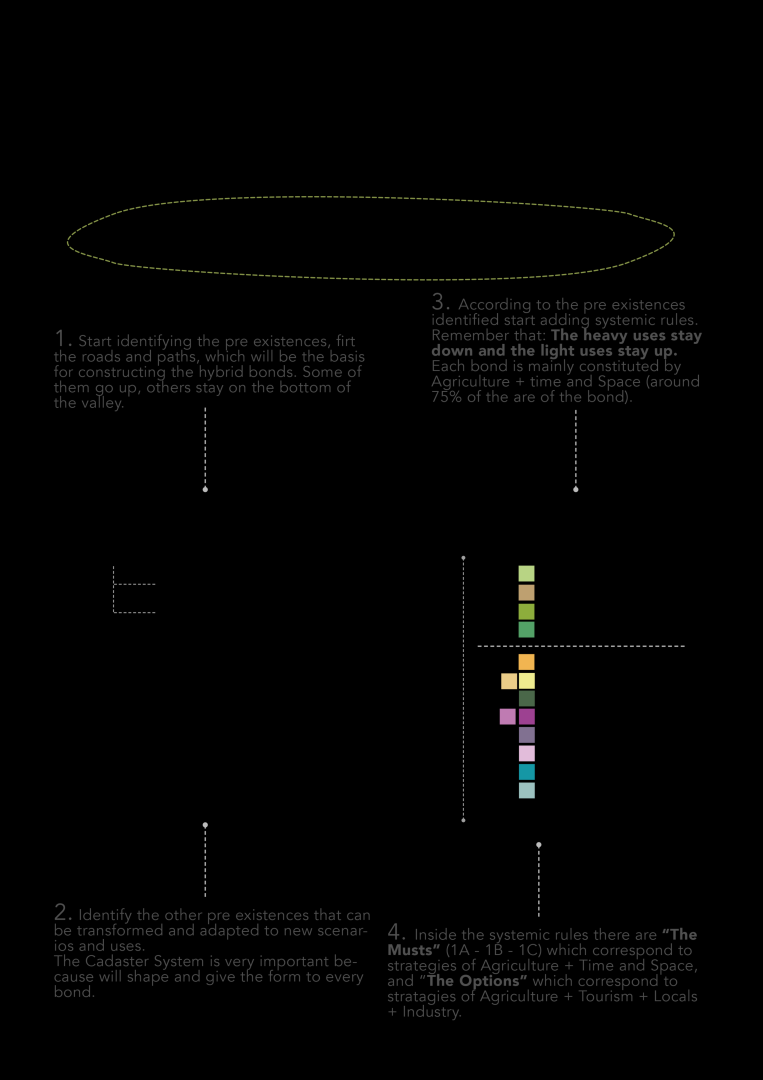 We started from the analysis of the site, identifying its characteristics that made us understand the way in which the valley works, concluding that one of the main activities that shaped the space was agriculture. The way in which the uses and their intensity were located throughout the territory was identified. We noted several dualities as predominant characteristics, and based on this we formulate the following hypothesis: Can agriculture be the link between all uses?