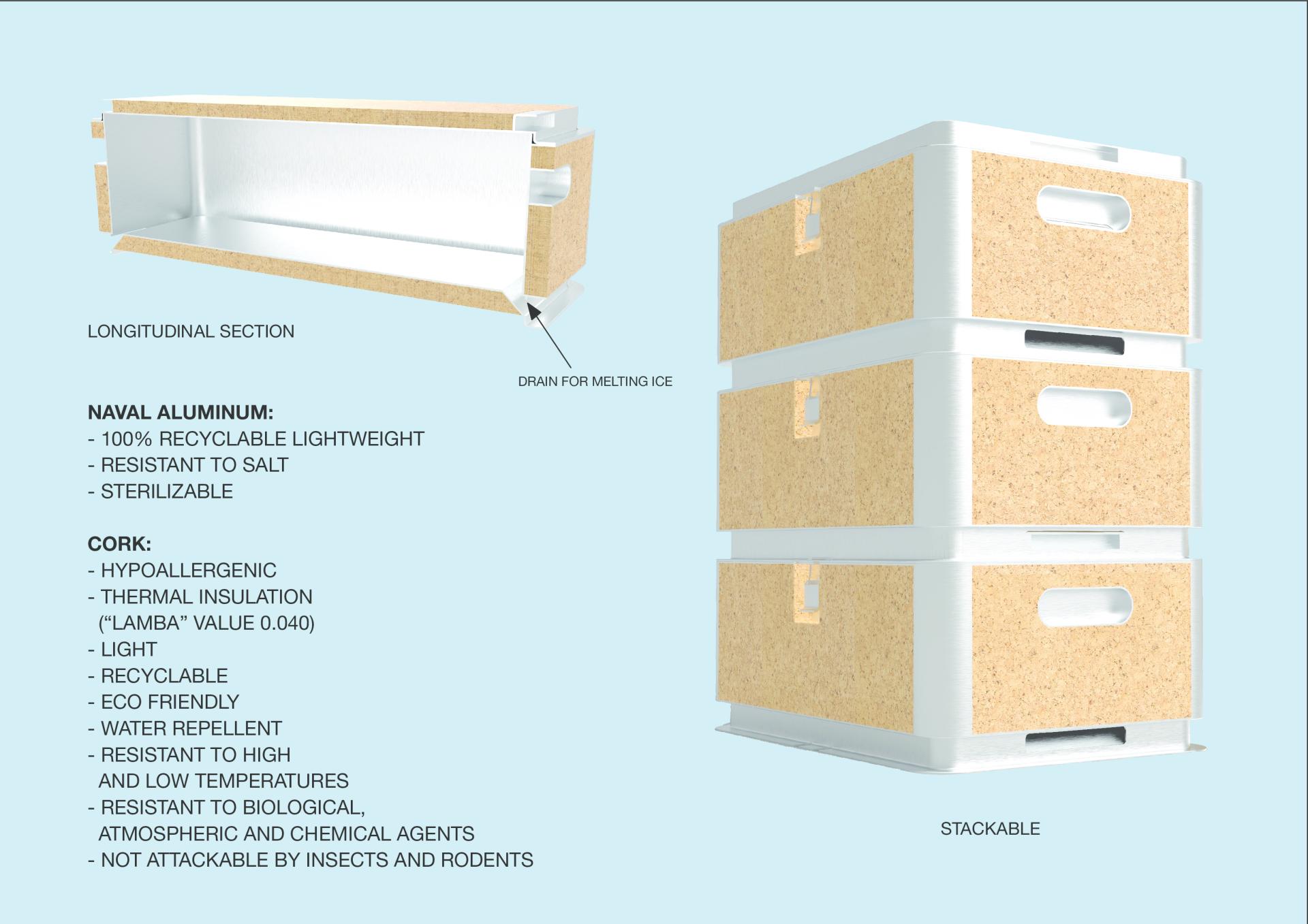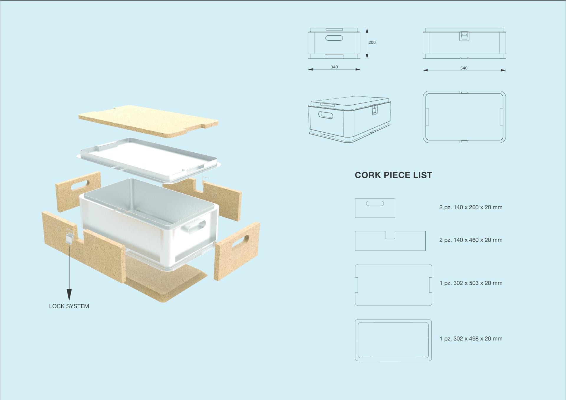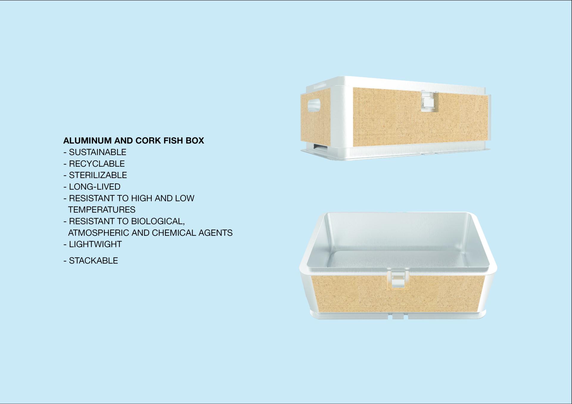 The main aim of the project is to provide a valid alternative to the polystyrene boxes currently used by the fishing industry. Considering the enormous environmental impact that petroleum-derived materials have on our marine and terrestrial ecosystems, the main idea is to provide a valid and practical alternative non containing plastic materials, and is possibly composed of natural materials or at least with a low environmental footprint in their production. Concerning this fact a box of aluminium and cork has been chosen in the attempt to compensate the potential and the deficit of both materials and to overcome the proper and winning properties of the common used objekt currently produced polysterene. From the union of two unique materials such as cork and aluminum, it has been possible to design a product that exceeds the performance of the starting model the polysterene fish box) and which first of all surely proves a lower environmental impact.