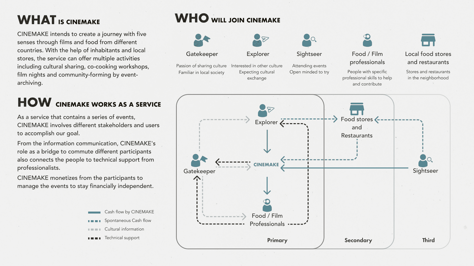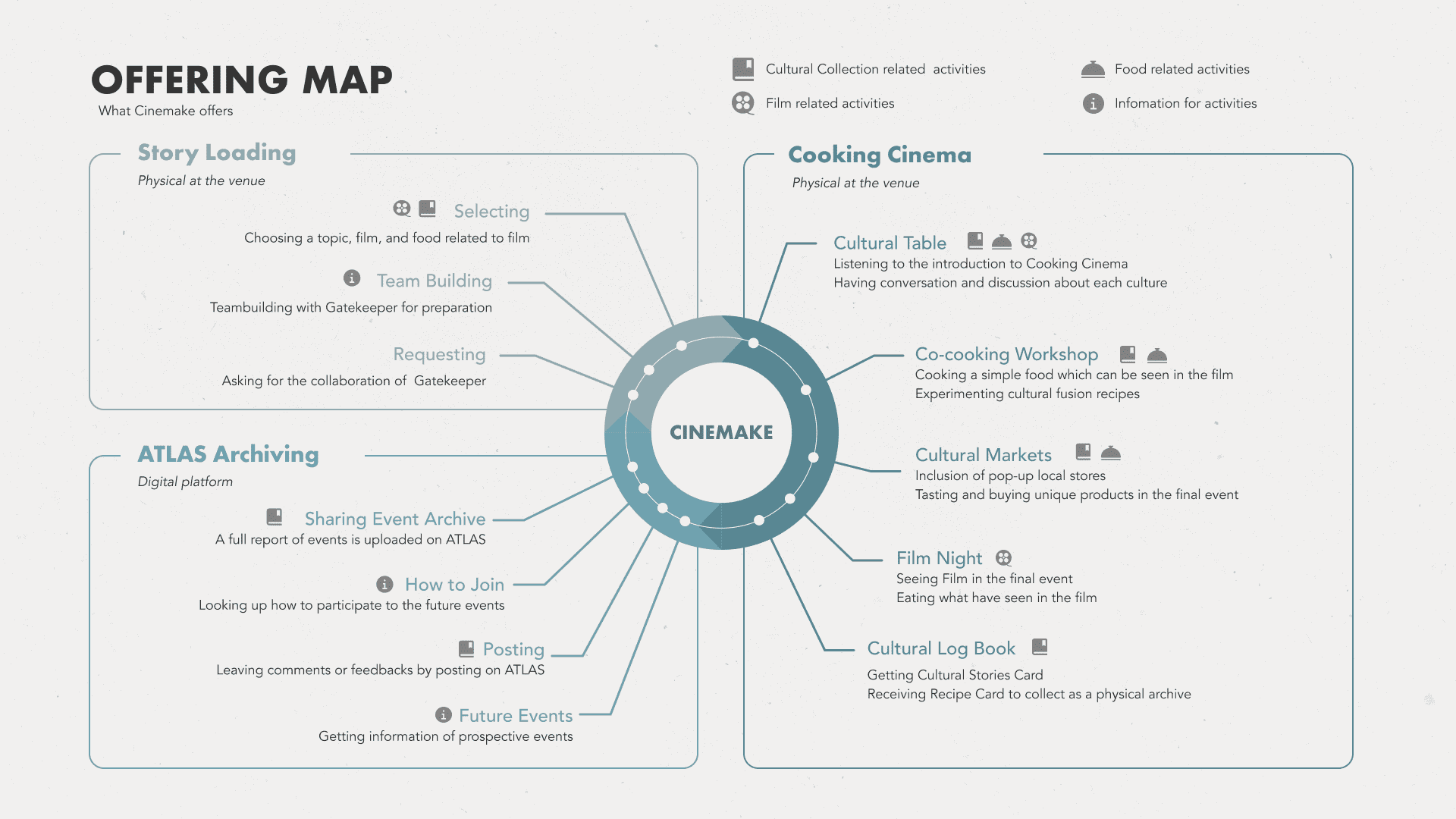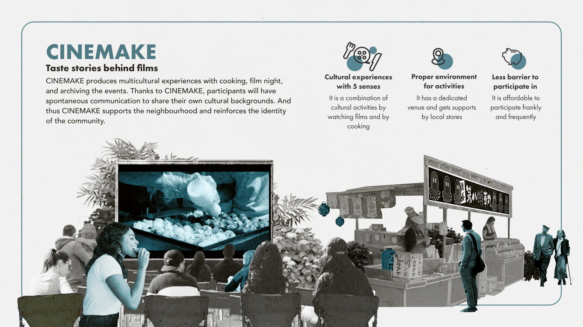 CINEMAKE is a service that creates a multicultural community. Its activities deepen mutual understanding through cultural story sharing: co-cooking of cultural food is collaborative and interactive; watching a foreign film in the original language is educative; cultural markets support economically the neighbourhood; the online platform ATLAS, archives cultural details to track and build cultural heritage. With CINEMAKE, the community becomes stronger thanks to its cultural diversity.