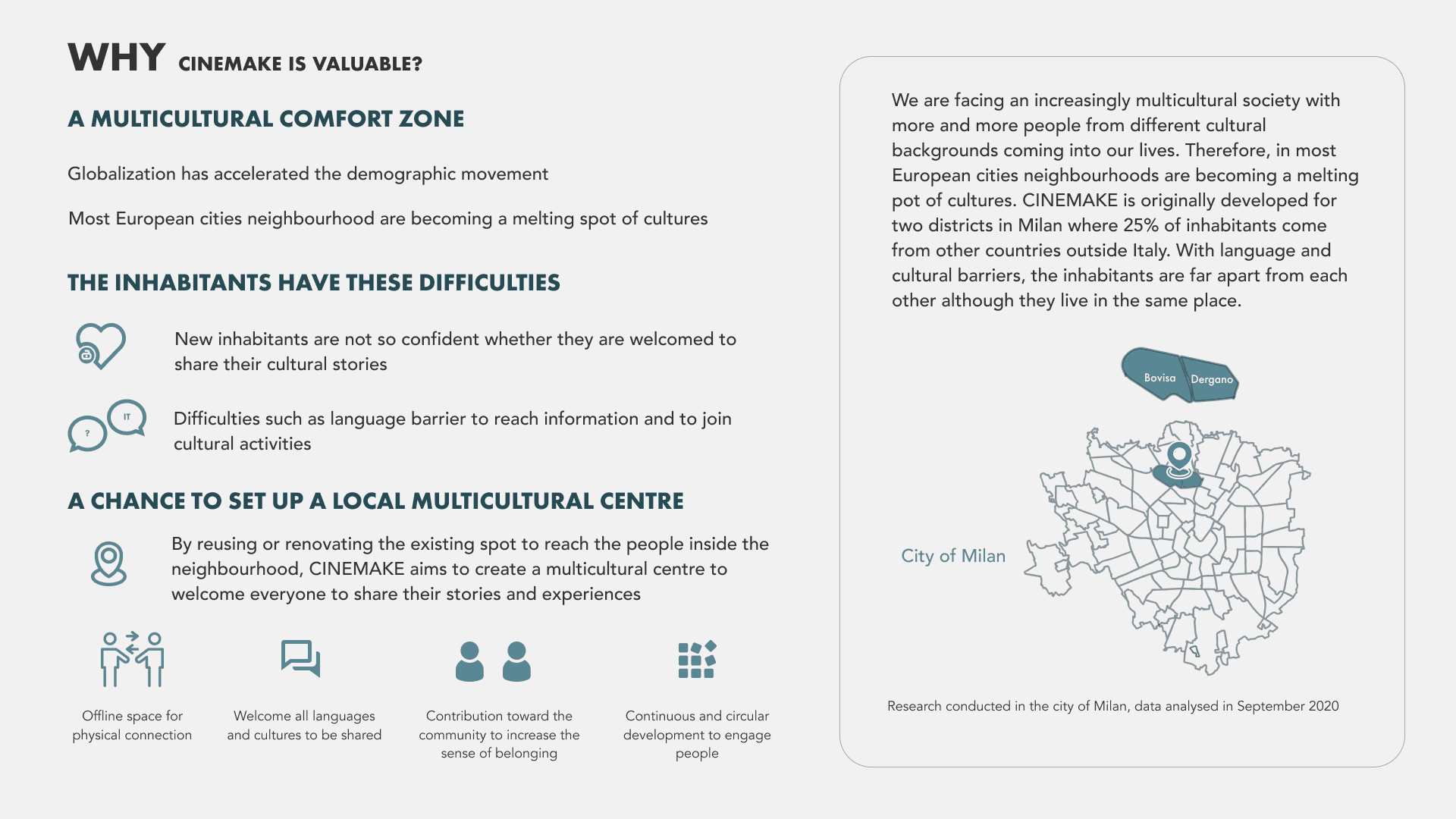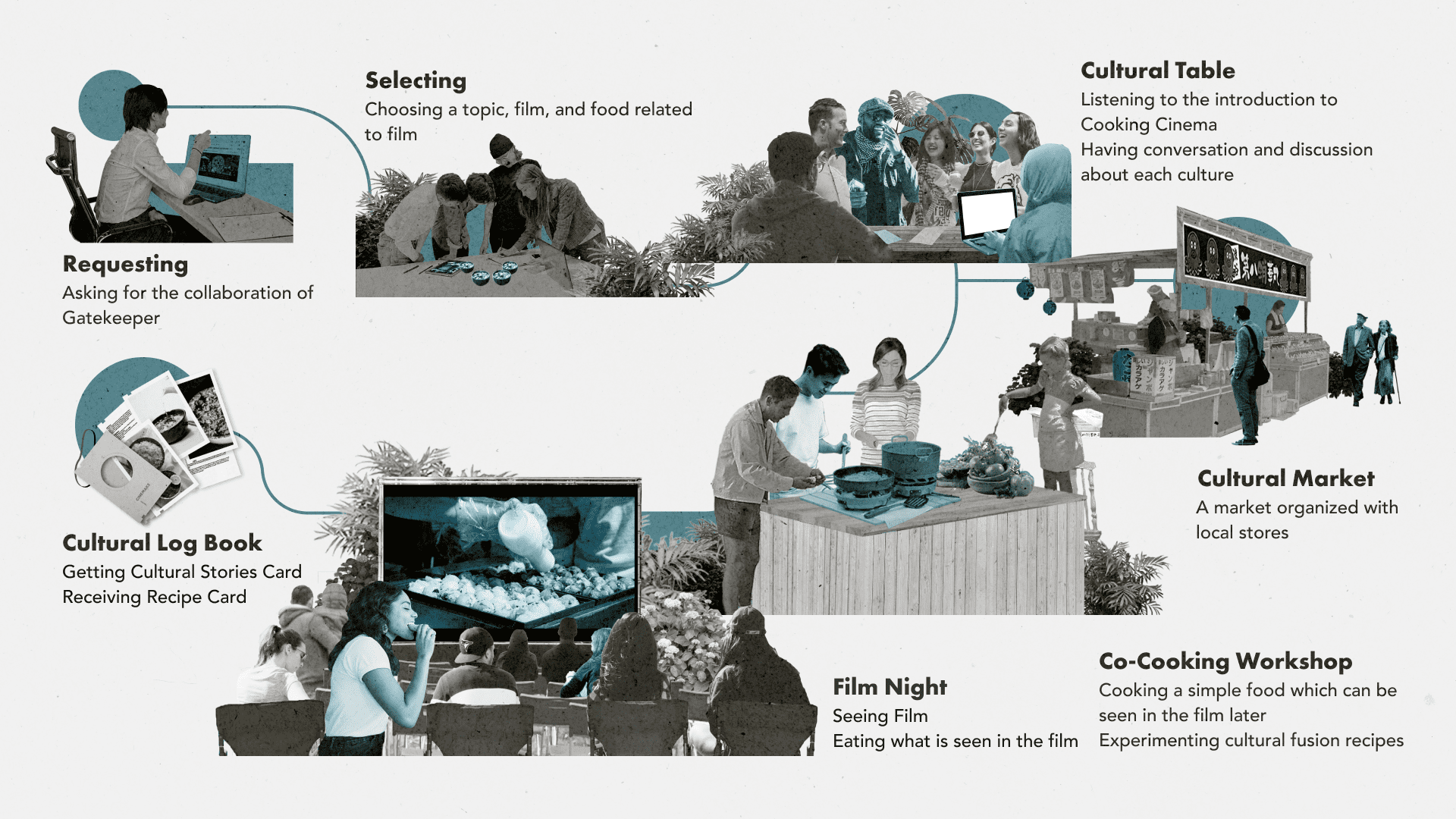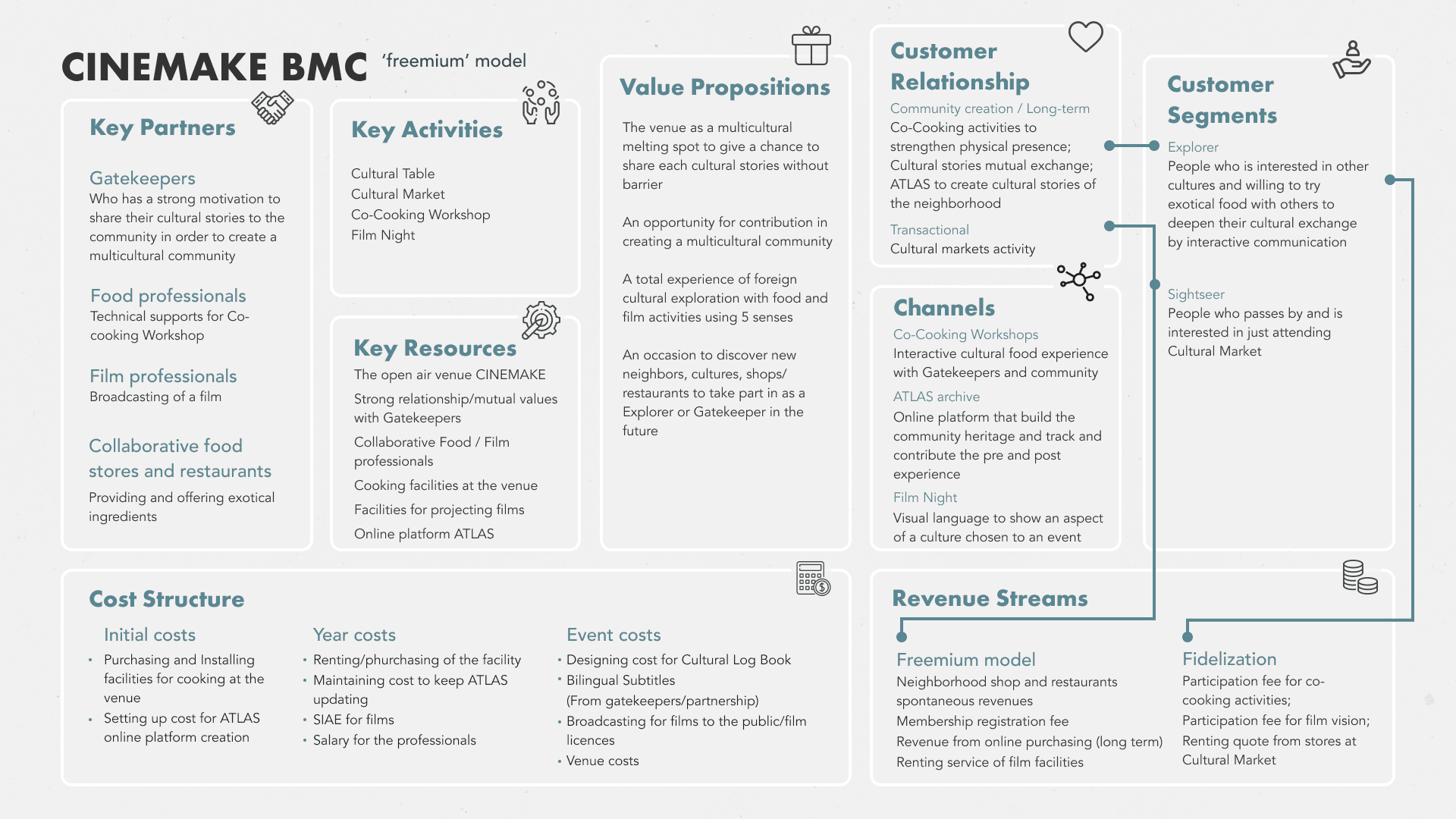 CINEMAKE is a service that creates a multicultural community. Its activities deepen mutual understanding through cultural story sharing: co-cooking of cultural food is collaborative and interactive; watching a foreign film in the original language is educative; cultural markets support economically the neighbourhood; the online platform ATLAS, archives cultural details to track and build cultural heritage. With CINEMAKE, the community becomes stronger thanks to its cultural diversity.