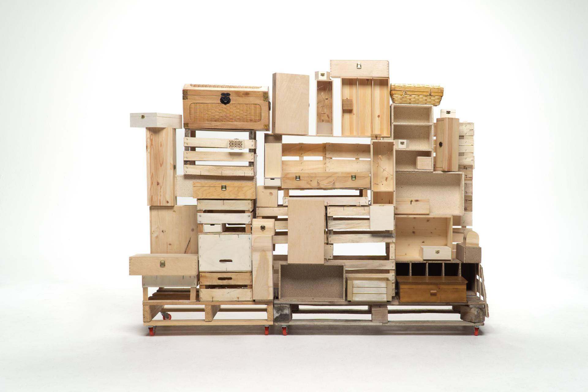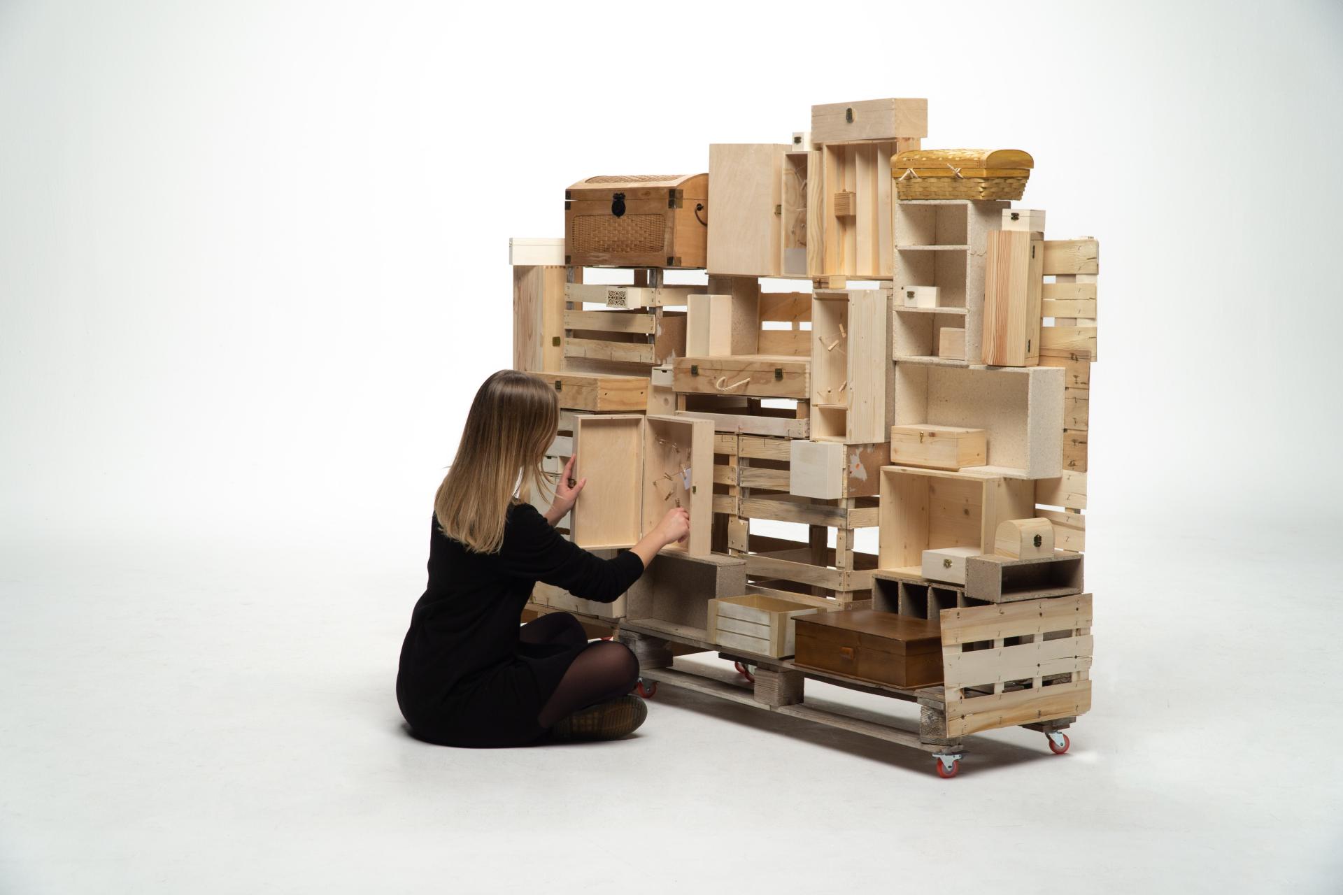 Inspired by the movement of Arte Povera — or poor art, an artistic tendency which, rejecting the cultural values linked to an organised and technologically advanced society, aims at the recovery of action, of the contingent, of the archetype as the only possibility of art — the product repurposes timber boxes as the fundamental building blocks of this machine.