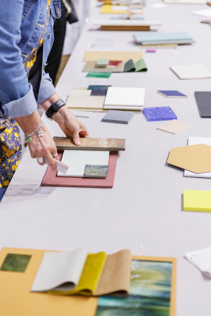 From the material samples the visitors are encouraged to make material collages or material mood boards, combining the samples to a beautiful combination. This materials collage is then photographed as a flatlay photo on the collage table, to recall the combinations and to share the images through social media channels. By reversing samples the visitors can review key material facts, directly from the samples.