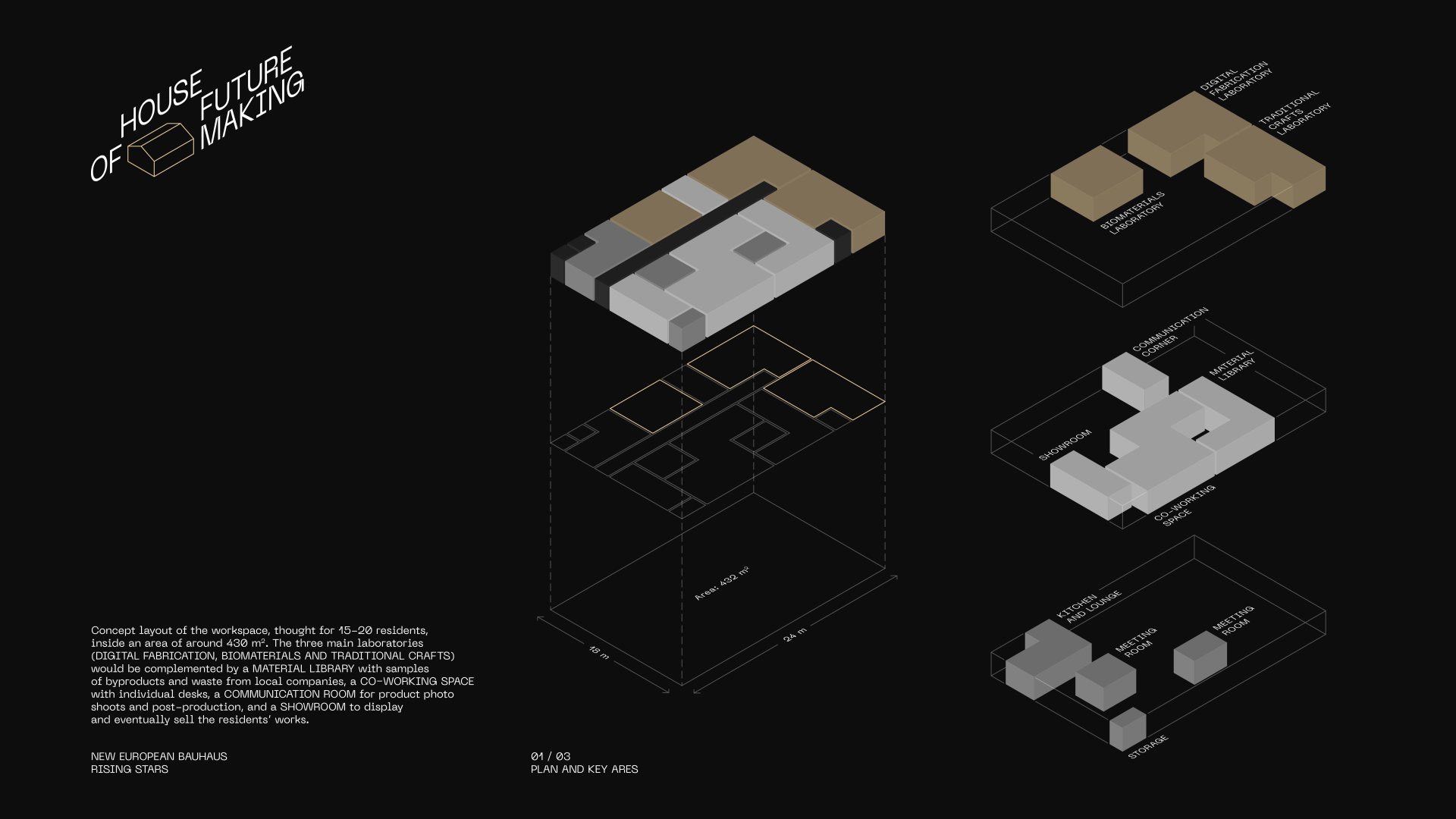 House of Future Making as a physical space requires its architecture (not in terms of the building itself, but in terms of the actual design of the space) to closely relate to—and in certain sense, to encourage—its content. We believe that new design practices, like the hybridisation of digital fabrication, biomaterials and crafts, need new spatial forms.
