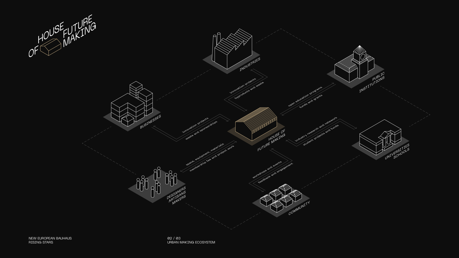At the same time, it is hard to imagine an open circular production without sharing knowledge and without inviting in as many entities as possible (community, companies, public institutions). Because if every part keeps its processes, materials and waste secret, how can you create an economy where the leftovers of one can be used by another one? This requires an unprecedented level of cooperation, a transparent access to each other protocols, processes and material flows, as well as an appropriate infrastructure able to host their exchanges, like the one proposed by House of Future Making.
