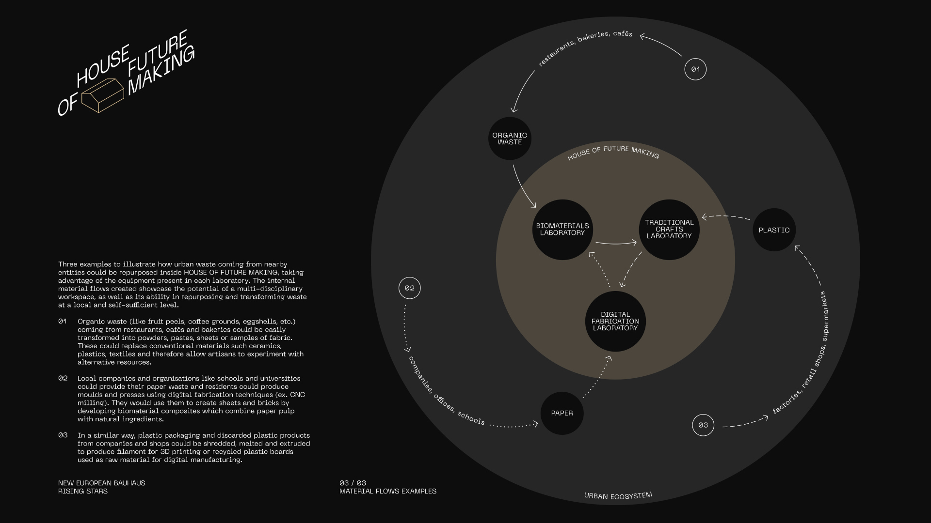 House of Future Making is a shared co-making space for designers, artisans and material engineers, who want to transform urban waste and by-products of nearby companies into valuable, ethically-made objects for the local community. Using both digital fabrication and traditional craft techniques, and fostering a circular economy of “made in the neighbourhood, for the neighbourhood”, we aim to bring manufacturing back into the city and enable the community to be self-sufficient and resilient.