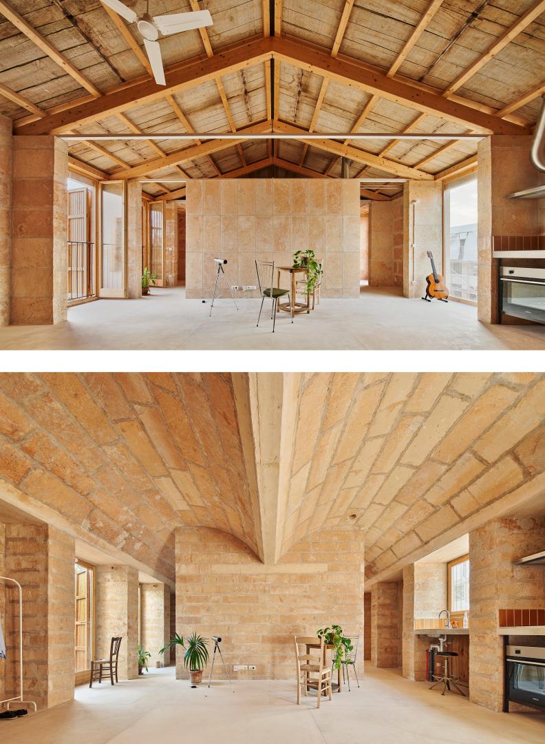They are located in Palma, Mallorca, and demonstrate the value of incorporating stone vaults and walls in housing projects as the main strategy to provide thermal inertia to cool for free in mediterranean summer through a low carbon structure as heavy as possible.