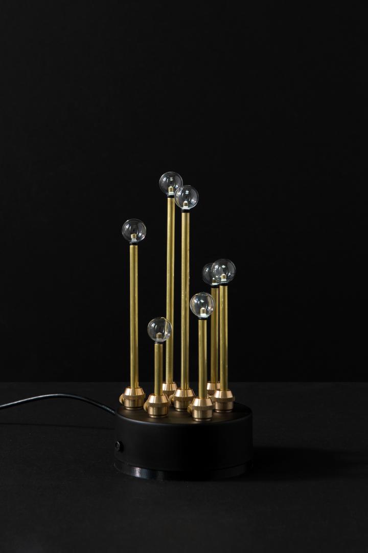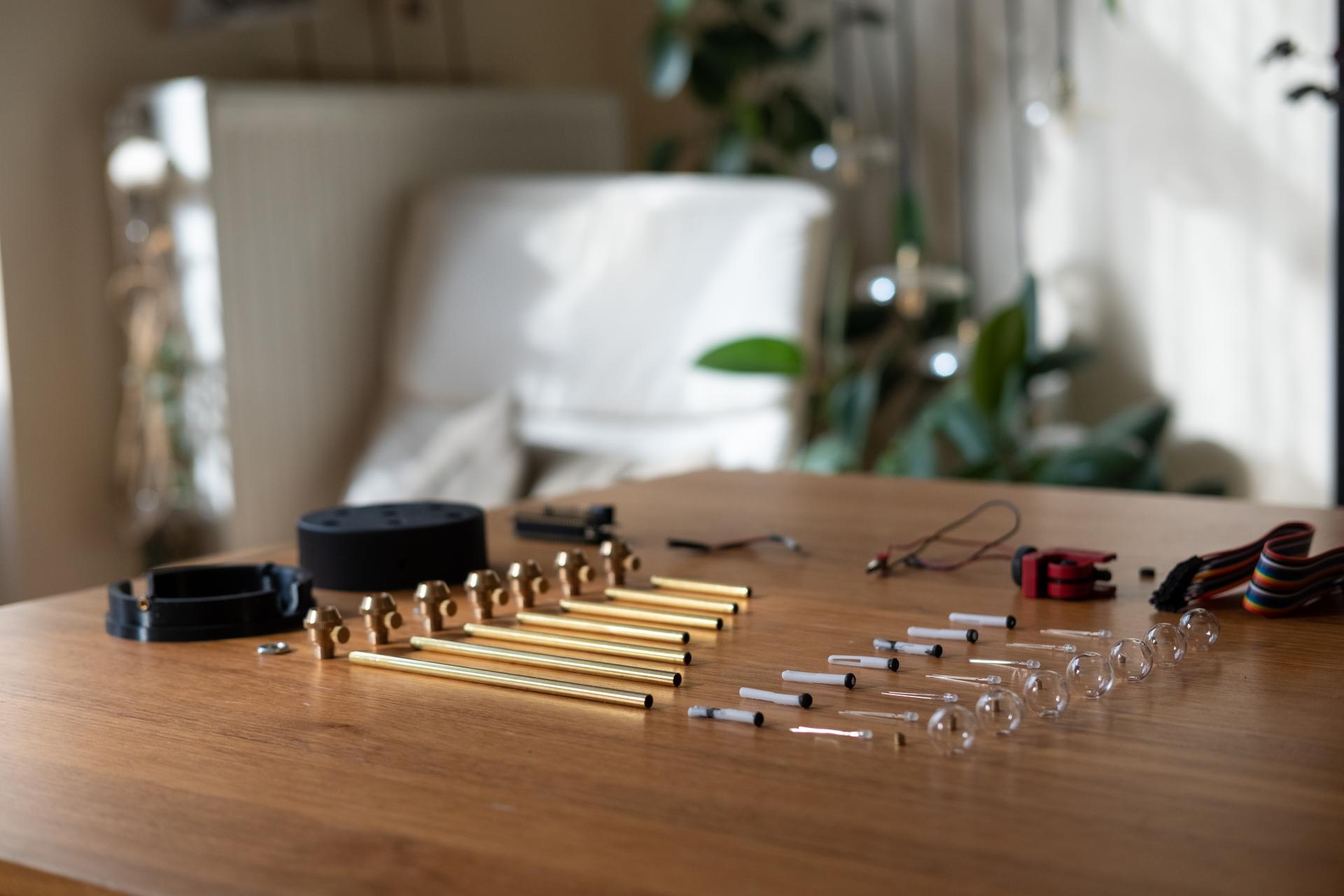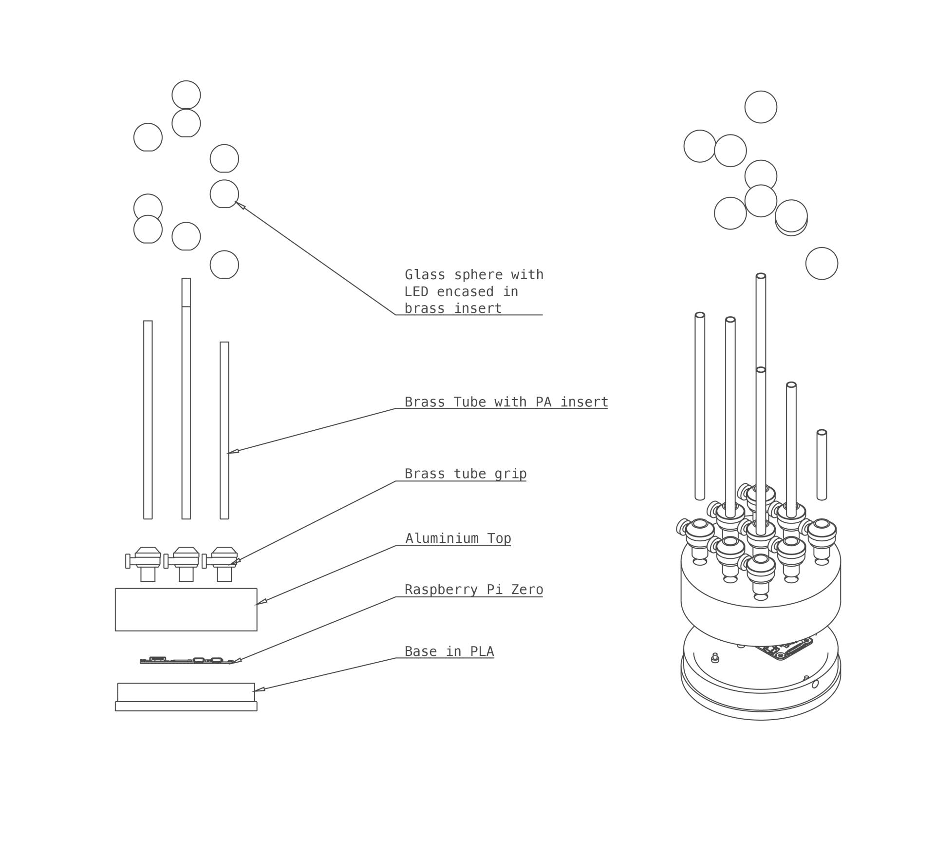 The lamp is made of brass, glass, and custom 3D-printed parts and includes a microcontroller connected to real-time open data on pollution that controls 7 LEDs. Once connected to the internet, the lamp will fetch data from public API to determine the air quality (PM2.5 and PM10). The LEDs are dimmed according to local air pollution measures available on citizen science sites such as sensor.community or smartcitizen.me.