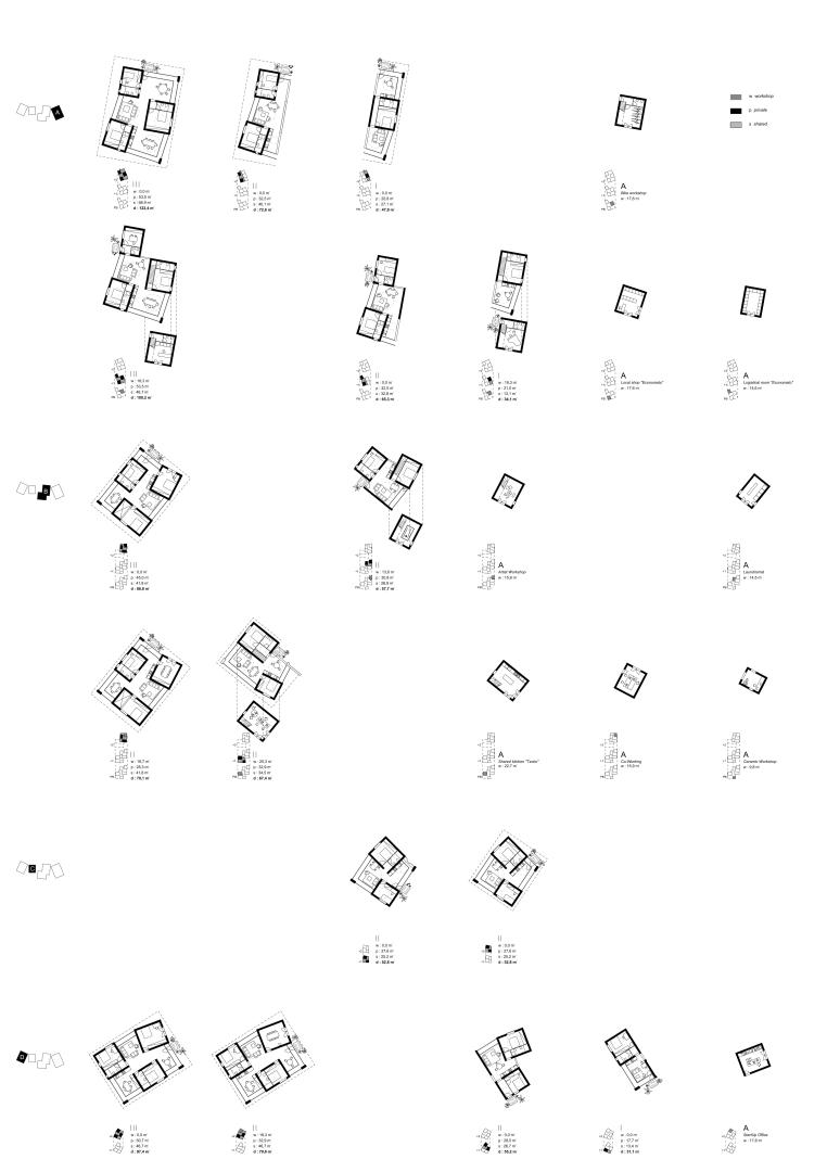 The layout of workshops along with the accessible path crossing the plot support this flexibility. The workshops enjoy a direct relationship with the public space and with the dwellings. This double connection allows for the use of the workshop from the house, a simultaneous use from both sides and a private use completely detached from the residential.