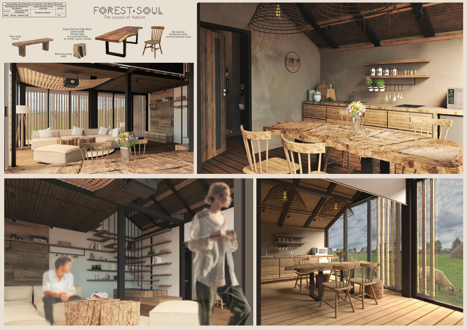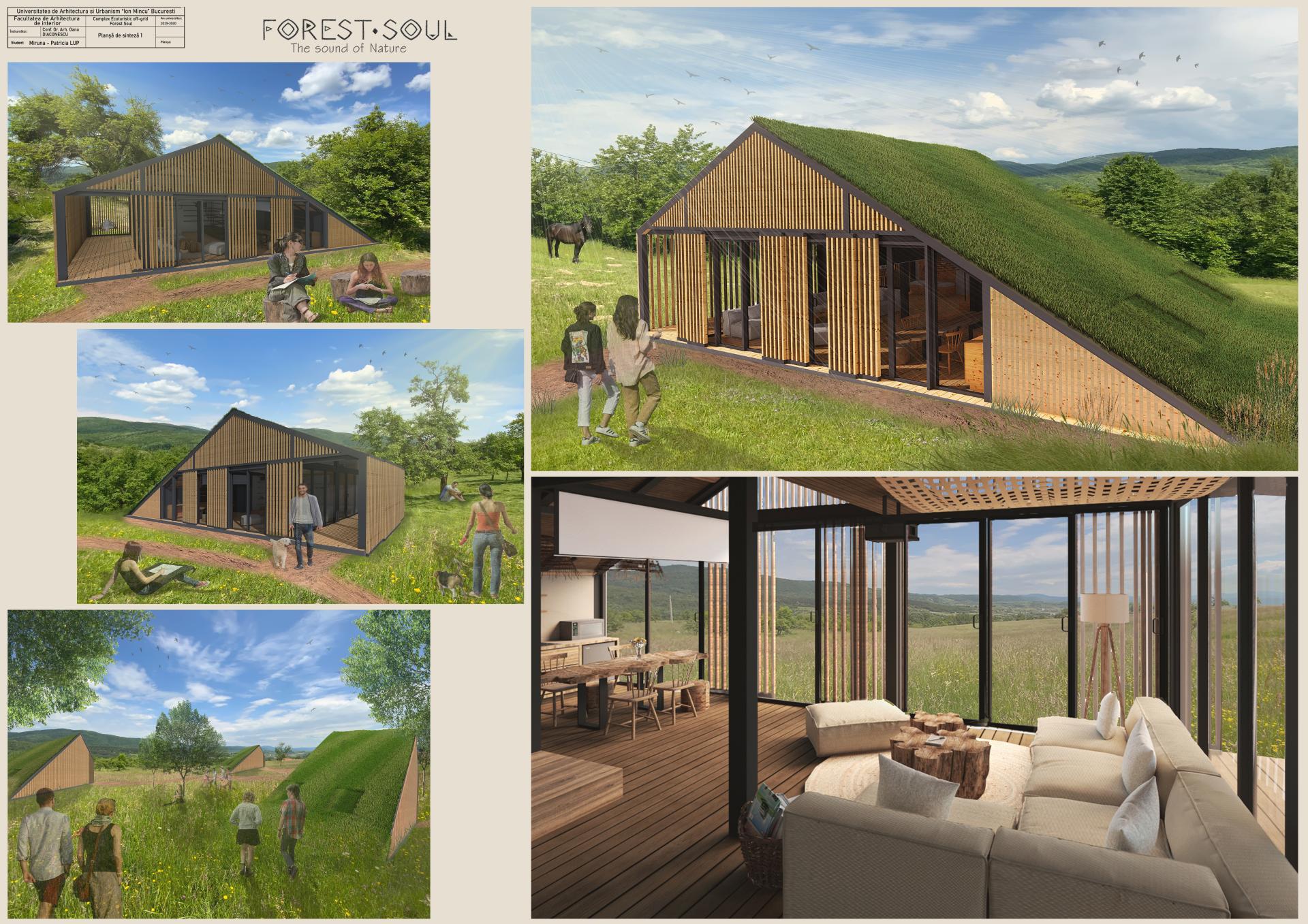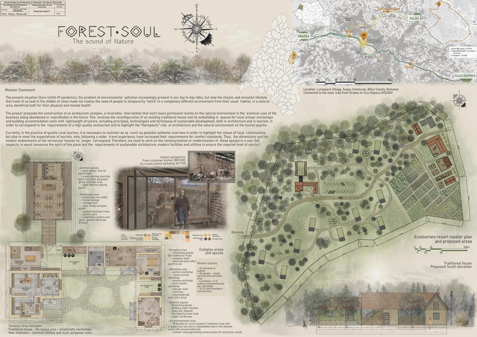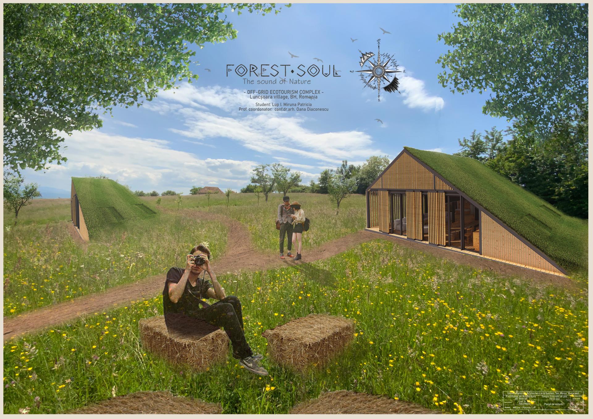 The project proposes an off-grid retreat or ecotourism complex in a rural area in the North-Western Hills of Romania, a reversible intervention that would not leave permanent marks on the landscape and natural environment. The concept is built around the relationship between human and nature, having the key words of sustainability, ecotourism, rural living, community, health and nature as a life and energy resource. The idea is to transform and convert an old house into common spaces (artisan and traditional crafts workshops, common kitchen, reception), to build multiple modular accommodation units and create recreational spaces as well as technical spaces for the on site facilities (energy, food providing - garden and farm for Km0 products, waste management etc.).