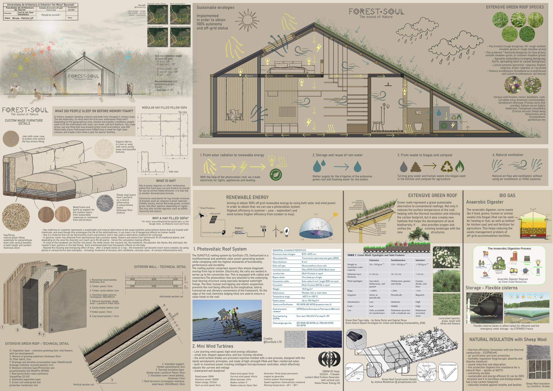 - ENERGY - Renewable energy, mainly from solar power due to the high light exposure of the area, especially during summer. This would be done with photovoltaic roof systems (such as the Sunstyle roof shingles from SunStyle LTD, because of the roof pitch criteria, meteorological conditions and the performance needed; or with classic photovoltaic panels)