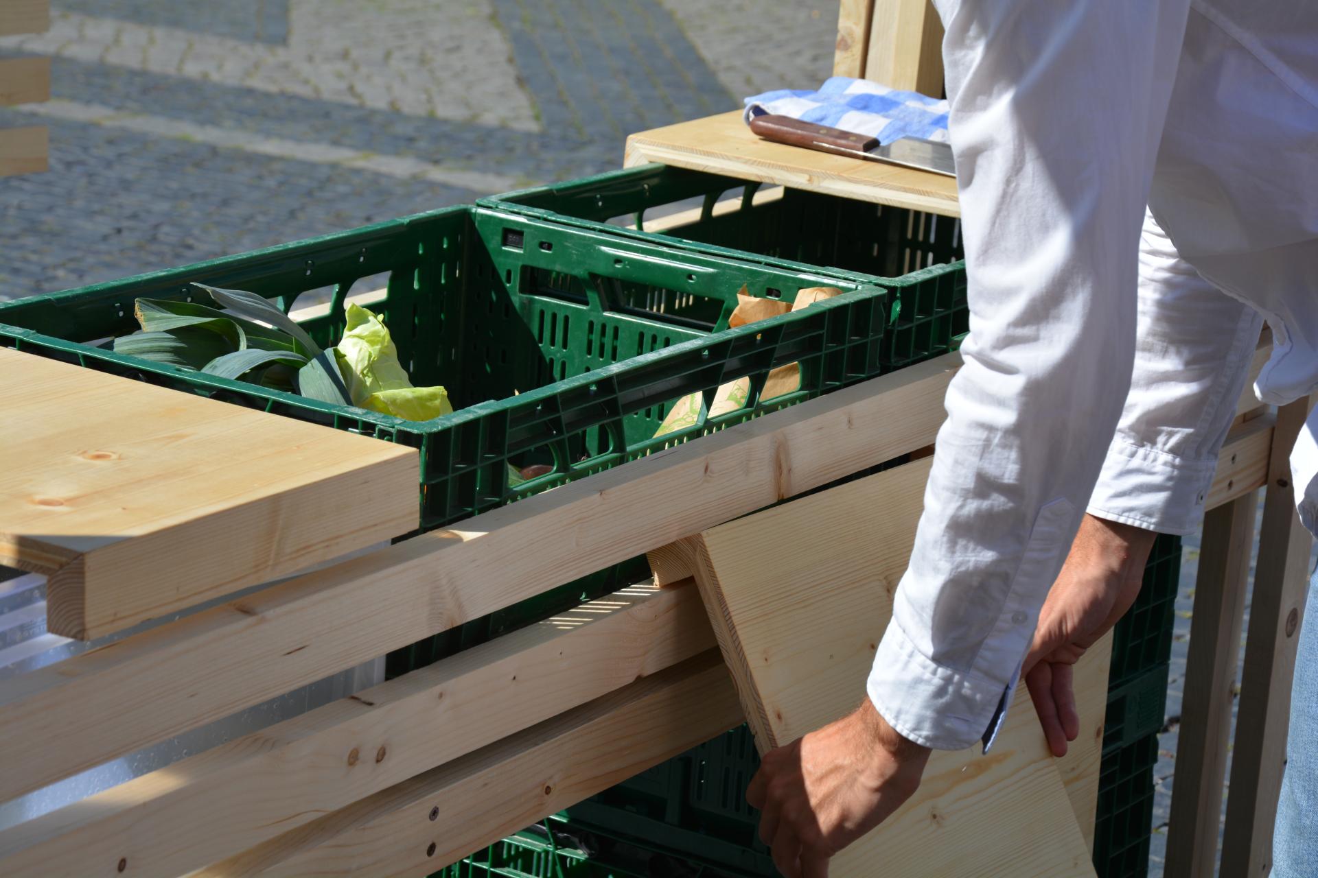 First, we looked at existing materials to contextualize them and provide them with a new purpose. Euronorm vegetable crates are a borrowed component and build the foundation of the Pop-Up. As designers, we took action by constructing add-ons made out of simple wooden planks to format the three functional cooking modules as well as seating and tables for guests.
