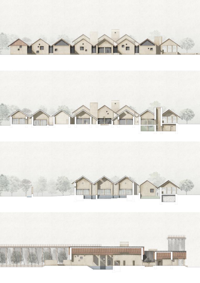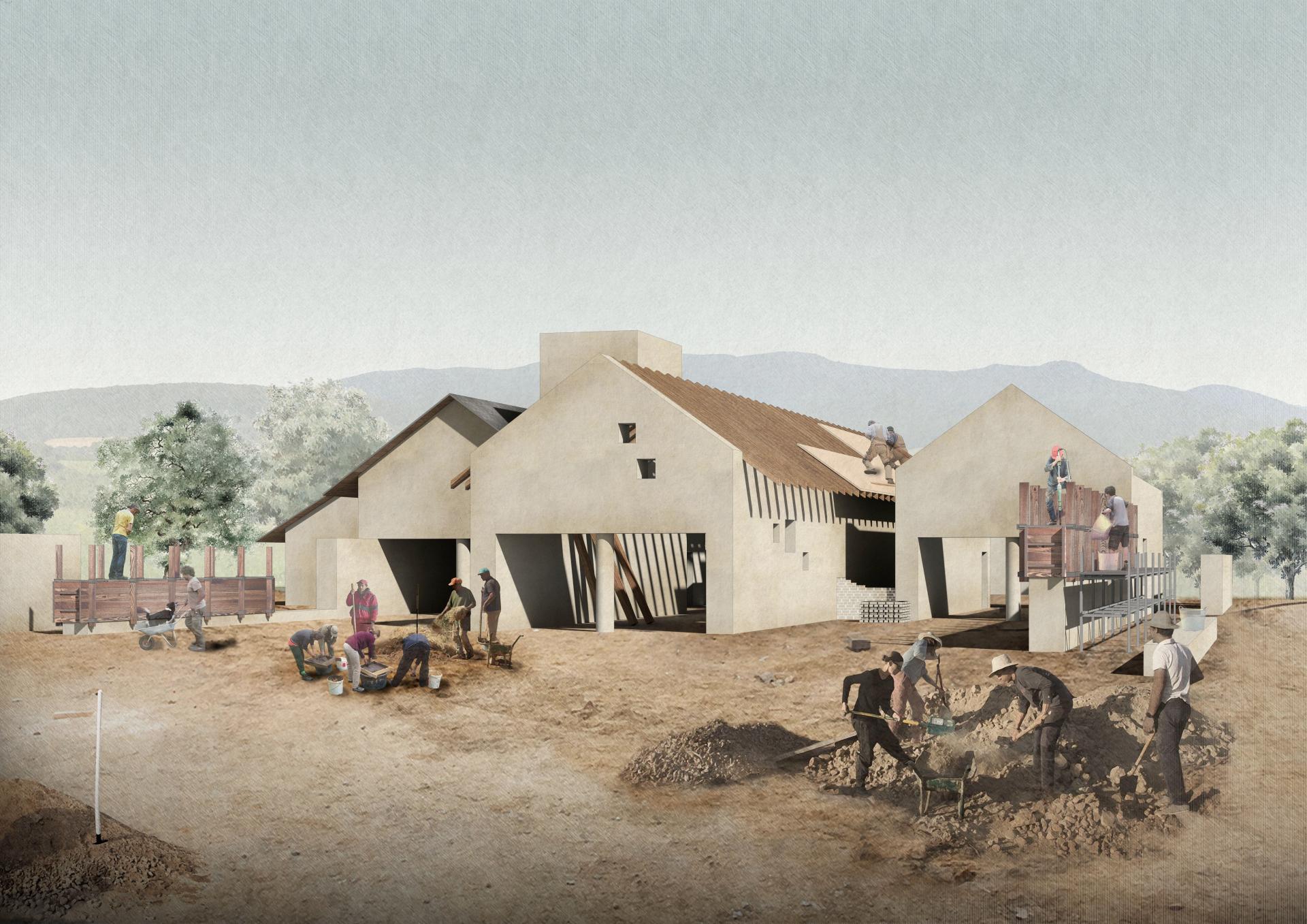 Architecture of all new proposals embraces knowledge of Slovak vernacular construction and translates it into contemporary building norms and aesthetics. Locally sourced earth is used as the main building material. The load-bearing rammed-earth walls are supplemented by a secondary layer of walls from the compressed earth blocks. The buildings are covered with an expressive wooden roof, which unifies different functions below. Apart from its positive ecological and health-promoting qualities, earth is material extremely suitable for the regions lagging behind, as it can be implemented almost anywhere, fully independent of lobbies, share prices and industrial price controls.