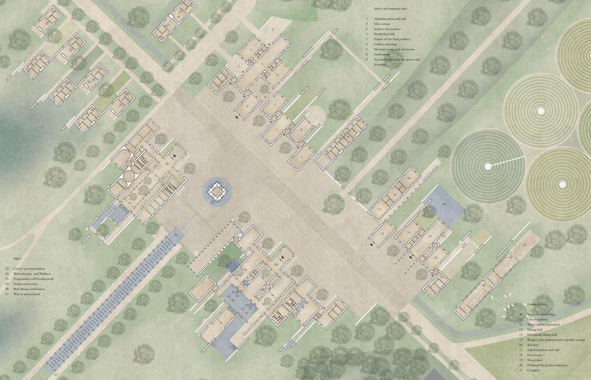 The principles of sustainability are manifested in four proposed projects, run as the collective facilities of the local community: an ecological farm, a bath resort (kupele), a community centre, and workshop spaces with ateliers. Complex development is planned to grow incrementally, together with improvements in the economic and social situation of the municipality. Phases of development: