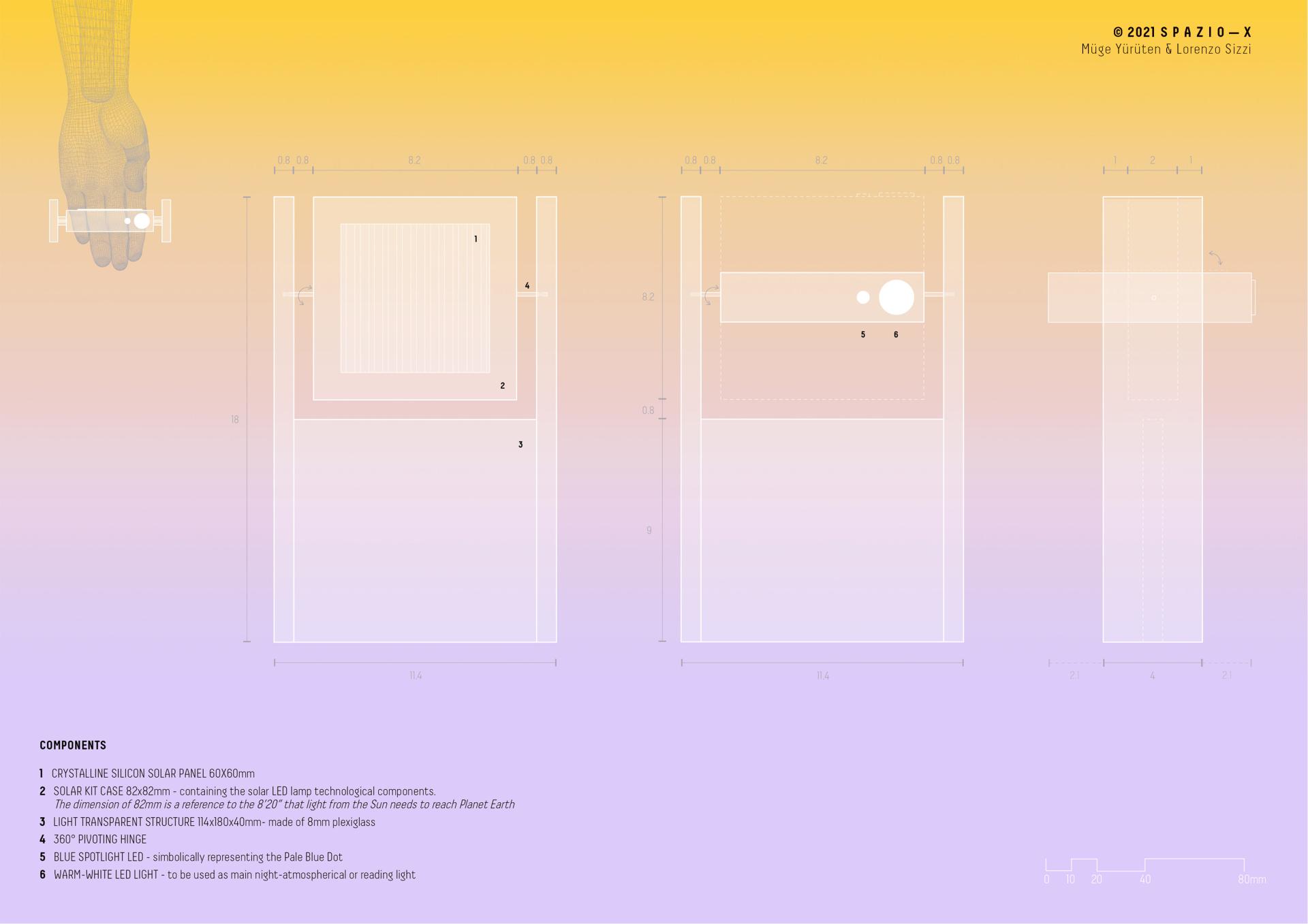 The 82x82mm case — an explicit reference to the 8’20” that light needs to reach the Earth from the Sun — is mounted on a small transparent structure, designed to be portable, and to fit on a windowsill or a small night table. The case is connected to the structure via a 360° pivoting hinge, thus allowing easily orient the solar panel mounted on the back of the case to catch solar rays and to freely address the lights during usage time. The position of the solar panel and the LEDs has been combined to allow a zero-maintenance use mode when the lamp is located close to a window: during the day — also in absence of direct sun — the daylight recharges the device, allowing from 5 to 10 hours of clean energy based on intensity and battery capacity.