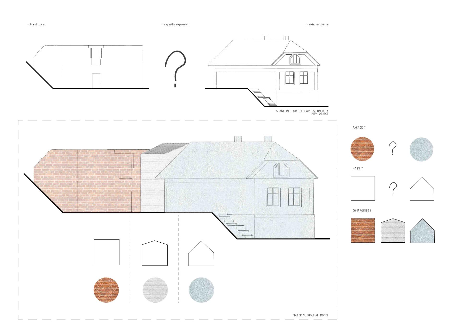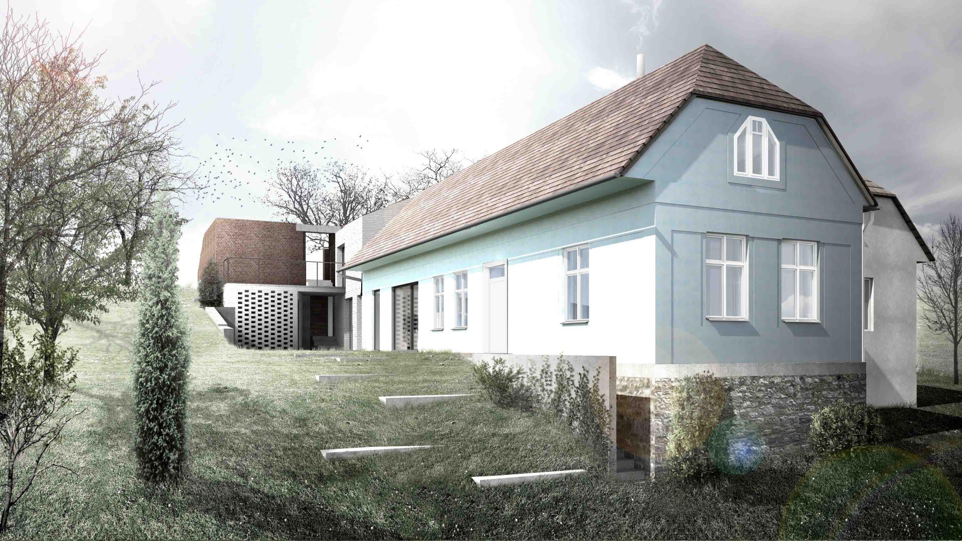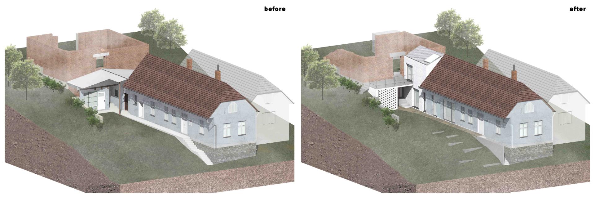 The house in Myjava is one of the few preserved houses of the original historical buildings. In this position he is one of the last solitaires of historical construction in Myjava and thus the main motive of the modernization methodology resonates the need to protect the authenticity of the work as a whole, which needs to be elevated above the need to protect the authenticity of original materials. The capacity needs of a growing family do not meet, which results in an increase in usable area due to the extension and a change in operation in the house. The extension does not want to compete with the existing house, but to be in line with it. The original extensions (stickers) do not meet the current criteria and have no higher value. Therefore, we decided to design an extension in place of the current extensions and did not take up fertile land. The extension itself will follow the original structure of the traditional house and will not draw attention to itself with the receding front wall. On the contrary. It will draw attention to the entrance to the preserved cellars under the old burnt barn. The material solution of the façade of the extension responds to the surrounding materials. The main material indicating the structure is a solid burnt brick, which will be removed from the ruins of an old barn and then used in a ventilated facade. It will be painted white, which will combine the idea of plastering and painting - as can be seen in a traditional house. The bluish color is restored to the traditional house as a sign of the original color. Our aim is to completely carry out the renovation and extension using only ecological and recycled materials available in the area.