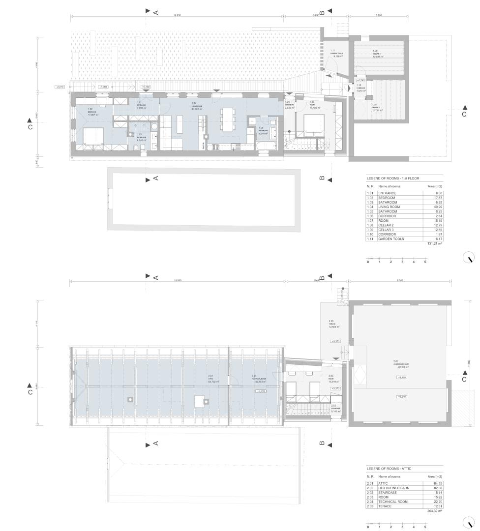 The main idea of the restoration in question is to preserve the proportion of the building, the material solution and the facade division. The layout optically communicates with the door and the exterior and extends the already elongated shape of the original house and door. Due to the change in the layout in the rear of the traditional house, the facade is being expanded on the facade and new transparent surfaces are being added to meet the needs of a more generous connection between the interior and the exterior. The shape of the roof planes remains unchanged, as does the attic space. In the back part of the house facing the elevated terrain, there are currently outbuildings in the form of cellars, a garden house, a burnt barn, which over time were added to the original traditional structure. We perceive them as extensions, which were created there over time according to the needs of the owner. In this spirit, we would like to continue and, based on the new requirements, replace part of the extensions with a new extension used for family living. The removed and subsequently added mass is located between the old barn and the restored part. The original extensions do not meet the current criteria and have no higher value. Therefore, we decided to use the area of these structures and not increase the built-up area. The extension itself will follow the original structure of the traditional house and will not draw attention to itself with the receding front wall. On the contrary. It will draw attention to the entrance to the preserved cellars under the old barn. A new garden house will be built on the site of the original garden house, which will be optically attached to the new extension of the house with its mass and material solution. Due to the need for sufficient clear heights in the living spaces, the slope of the roof in the extension was slightly increased. The material solution of the façade of the extension responds to the surrounding materials.