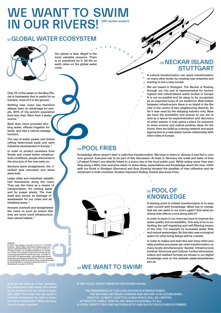 The connecting element in this multi-layered project is the positive established narrative around the water, bathing and swimming. This narrative should lead to a cooperative and just development of our rivers and water ecosystems. The different levels of digital to analogue, unlocated to located, complex to fun, are created by the project elements and initiate this development. The digital available knowledge builds a basis for discussion and provides information for possible approaches of change towards an ecologically sustainable future. The Kiosk is the movable tool to create space for these discussions and opens up an inter-communal exchange. The Island builds a local anchorage for actual change. The aesthetics and atmosphere of these elements support the connecting narrative.