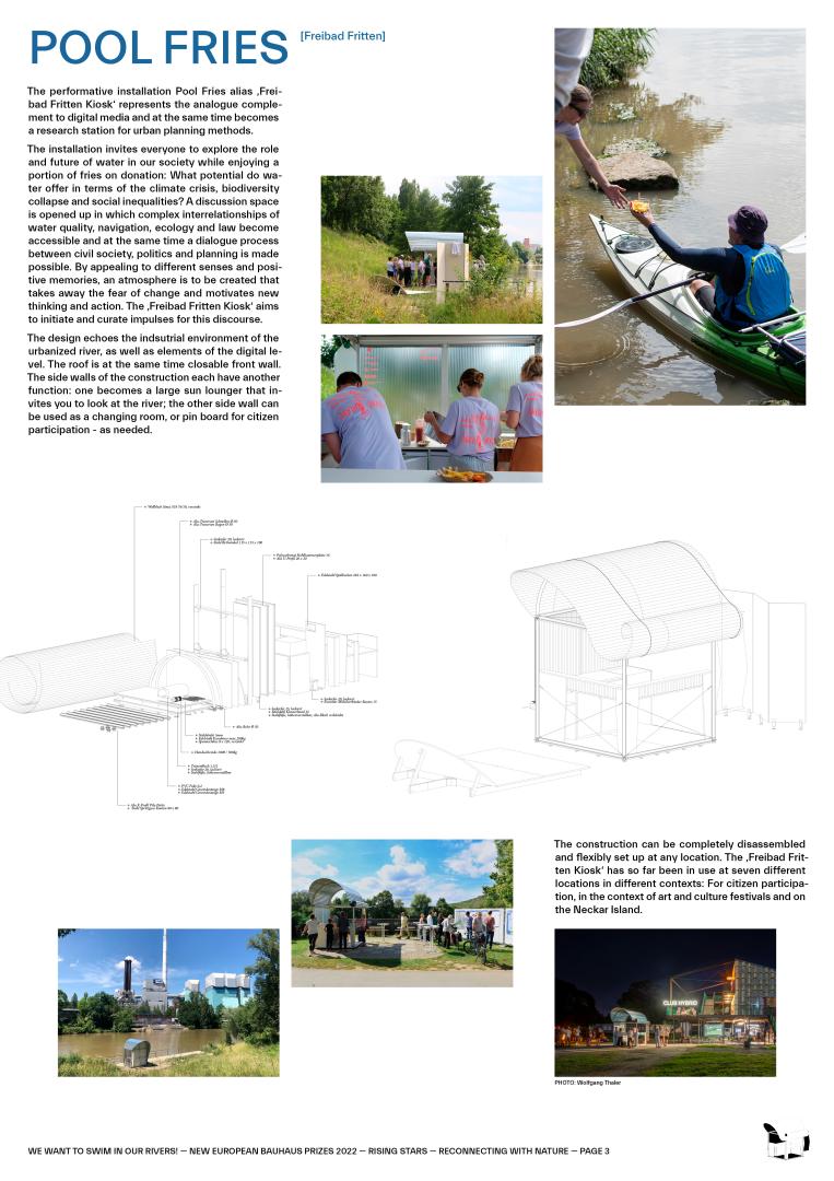 Through our design of the performative installation Pool Fries (“Freibad Fritten”) on the river banks and implemented actions on the Neckar Island we reconnect people spatially and emotionally to their local rivers. By confronting and actively involving the civil society in the design process we ensure a sustainable development through their commitment and identification to the water body.