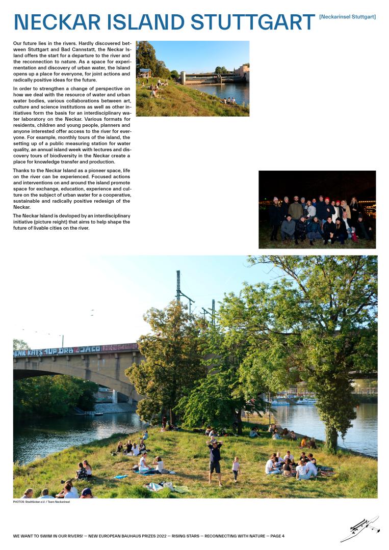 The Neckar Island provides a central semi-public space accessible by public transport and by bike. Different formats activate the Island and invite different stakeholders and the general public. In example, monthly island tours and discussions are offered to everyone interested. Through workshops and educational formats on the island accompanying the research in cooperation with educational and cultural institutions as well as specific water and ecosystem experts, the discourse on content is actively conducted and made publicly accessible for all ages within the framework of the Neckar Island laboratory.
