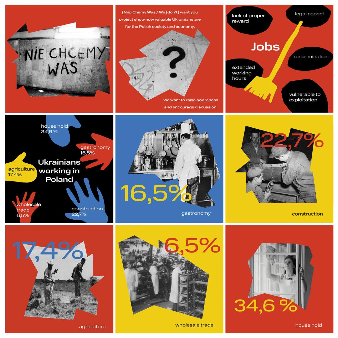 ‘We don't want you’ project is about Ukrainian migrant workers facing discrimination in Poland. It is designed by a Ukrainian and Polish student team. We want to raise a discussion to reconsider the importance of migrants from Ukraine and thus show how valuable they are for the Polish society and economy. Our design is not mute, it has a societal impact. We want to promote the vision of creating sustainable opportunities and working conditions for all. We want to make a point that we are all the