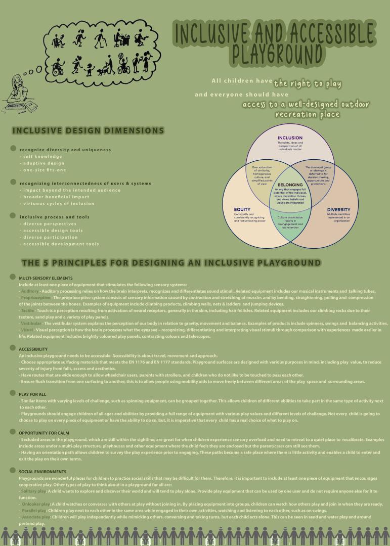 The central objective of social dimensions of sustainable growth is correct distribution of opportunities between generations. A high level of employment and quality workplace, represents the relationship between economic and social dimension of sustainable growth. The inclusive parks intended for people with disabilities are few or nonexistent in some cities, although the number of beneficiary is pretty good. The sustainability is a solution to ensure that any decision taken will be friendly with the medium and will not have a negative impact on society. The children are more and more attracted of investigation and engagement regarding climate change and it s devasting effects, so we should encourage them to learn through exploration, both in school and non-formal mediums. For a child with mobility is easy to explore the nature regardless the context, but for children with disabilities is it necessary special and dotated places which offer them the opportunity to participate at actions and games intended for children. We want a better world with happy people, living together regardless social or fizical condition. We imagine a world in which every person with disabilities can stand on his own, with a minimum help from the others. In this way, we are increasing their motivation and quality of life, a special principle of sustainability. We believe that this project qualify in all the principles which represent the 3 pillars of sustainability and sustainable growth, being a project designed and projected on long term for society, for people, for improving the relationship between people with disabilities and including them in society. The environment will be in the advantage of it, and creating more green spaces in towns to achieve the requirements for disabled people and from the economic point of view, the costs are average, but the beneficiaries will have the most to gain from this project, beacause represents a large community.