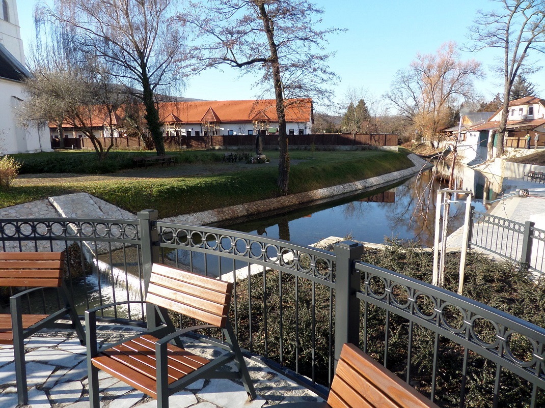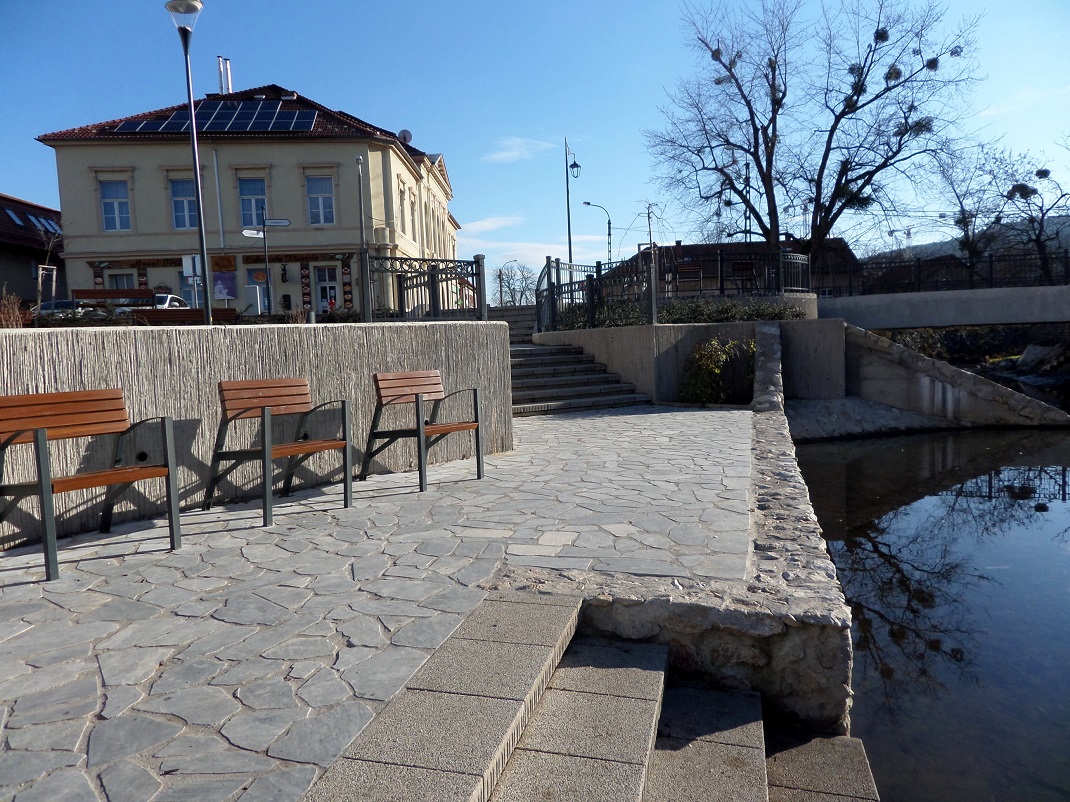 Construction of Pope John Paul II Square started in October 2019 and will be completed in December 2020. The development has improved the structure of the Pope John Paul II Square by using high ornamental planting and various garden architectural elements and outdoor artworks. The bridge over the Szinva stream has been renewed, widened and modernised, and a fountain has been built as a decorative feature of the square. The project has increased the amount of green space and vegetation, contributing to the principle of a more sustainable city and ensuring better air quality for the residents. Terraces and walkways have been built on almost 3400 m2. A retaining wall has been built along the Szinva stream, a water step has been built in the stream bed and the riverbed has been restored. From the finished square, you can walk directly down to the Szinva stream, allowing you to observe aquatic life up close, bringing you back to nature, which is one of the reasons why the square has become so popular with Miskolc residents. The square is bordered on one side by a church and on the other by a row of ten-storey apartment blocks, which gives the area a stark contrast, but this does not detract from its value, rather it enhances it, providing a special and unique atmosphere for those who relax here.
