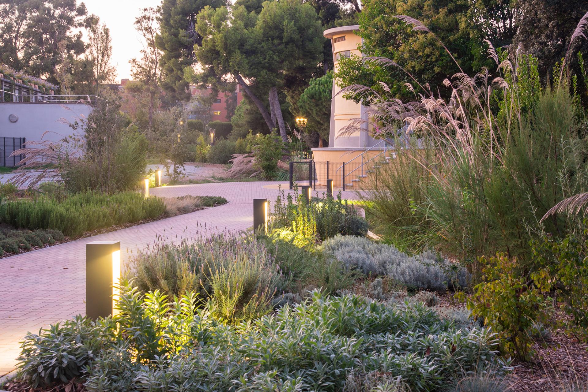 For the industrial garden, an analysis of the original garden project (1930) was carried out and some paths adapted to current needs were recovered. Vegetation of native plants with low water yield and agricultural techniques (gravity irrigation, planting, mowing, etc) is used. A system of collection, conduction and infiltration into the ground is designed. The sustainable drainage systems used are based on nature (drainage ditches, infiltration wells, permeable paving and filtering drains). Traditional materials (e.g. open-joint dry-laid paving) are used with innovative techniques. A space for biodiversity is integrated where flora and fauna cohabit: the 'butterfly garden' with the 'insect hotel'. The access to the site and the parking space is new, where the use of sustainability principles and a rainwater collection network is designed, so that it is a sustainable drainage system and faces a paradigm shift in water management. The water infiltrates into the subsoil and aquifer recharging water levels, as well as being useful for irrigation.