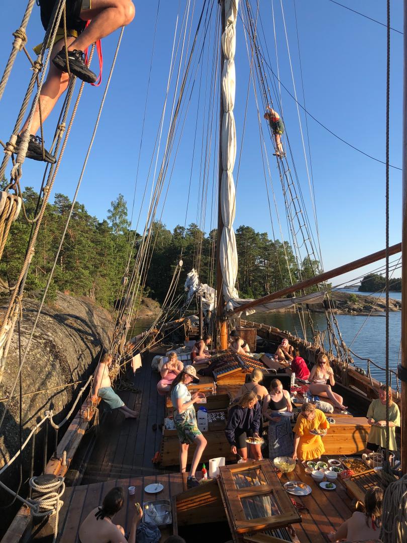 Distinctive aesthetics and high-quality experiences are central to Ilmastoseikkailu. The event is a truly unique experience that takes place on a traditional wooden sailing ship, galeas Astrid (https://purjelaiva.fi/laivat1/maux-astrid), surrounded by the Finnish archipelago, a natural landscape which is the primary aesthetic feature. The workshops are based either inside or on the deck of the ship, creating a marine atmosphere. Some workshops include slideshows that have a clear and fresh aesthetic. The event serves delicious plant-based food that is arranged on the wooden deck of the ship. Between workshops, the participants eat quality food, take a refreshing dip in the sea, and explore the nearby islands.