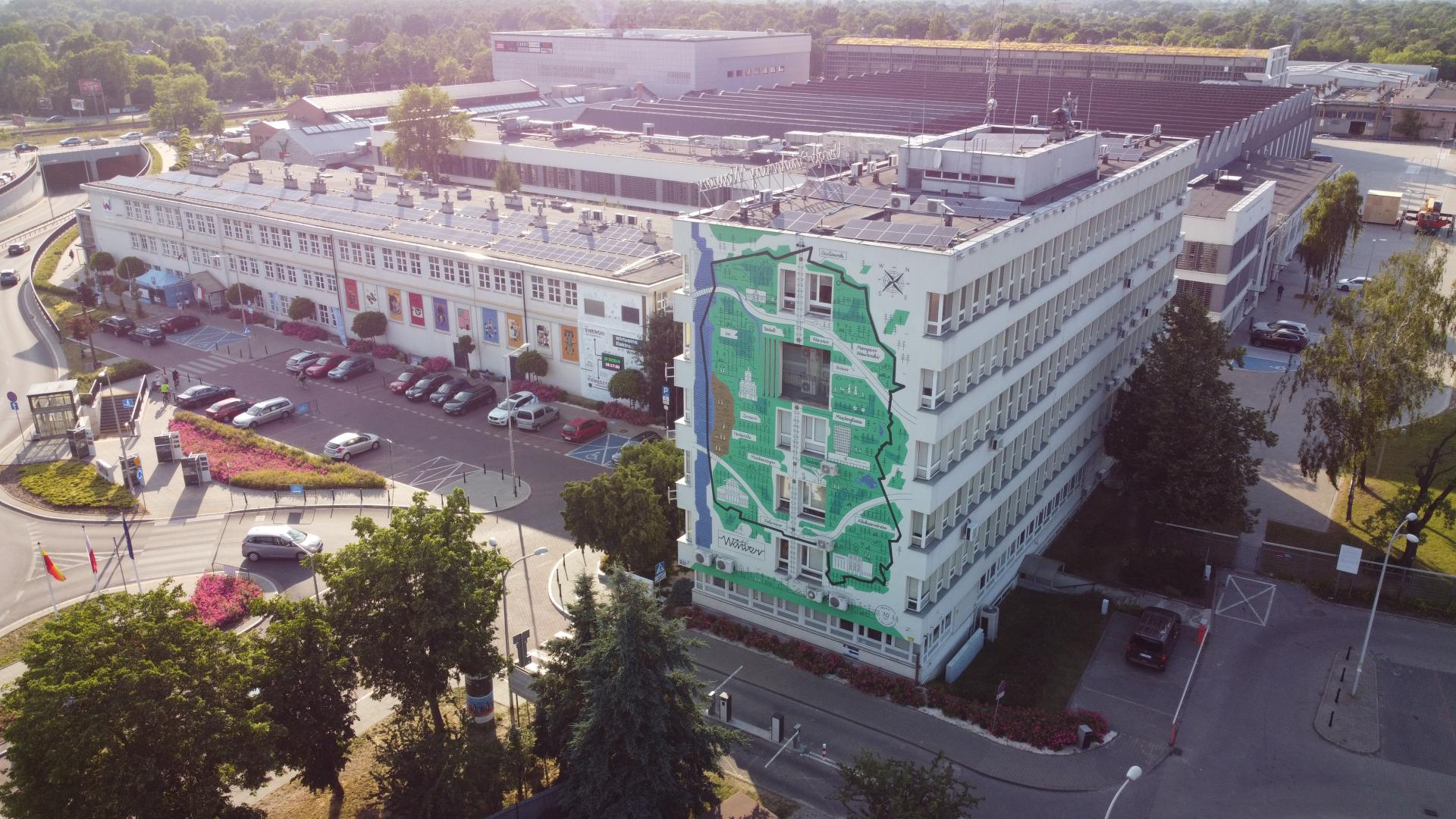 The mural, with an electronic display showing the values to which electricity obtained from renewable energy sources can be converted, was designed by artists responsible for the preparation of the visual identification of the district. The graphic style of identification was developed on the basis of a multi-stage process, taking into account the participation of many groups of stakeholders, qualitative and quantitative research of the district, workshops with officials and residents. The proposed system of icons, pictograms, logos, colors, typefaces, etc. - reflects the most important values of the district and emphasizes the resources that Wawer has. The mural is located in the immediate vicinity of the Town Hall, on which there is a neon sign with the name of the Town Hall, and another mural with a map of the district. All three elements form a whole and harmonize with each other within the form.